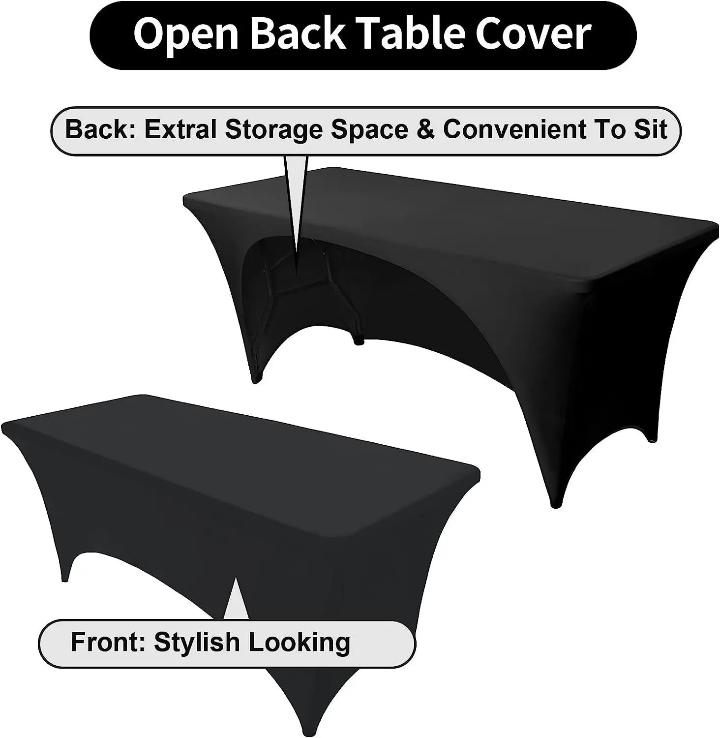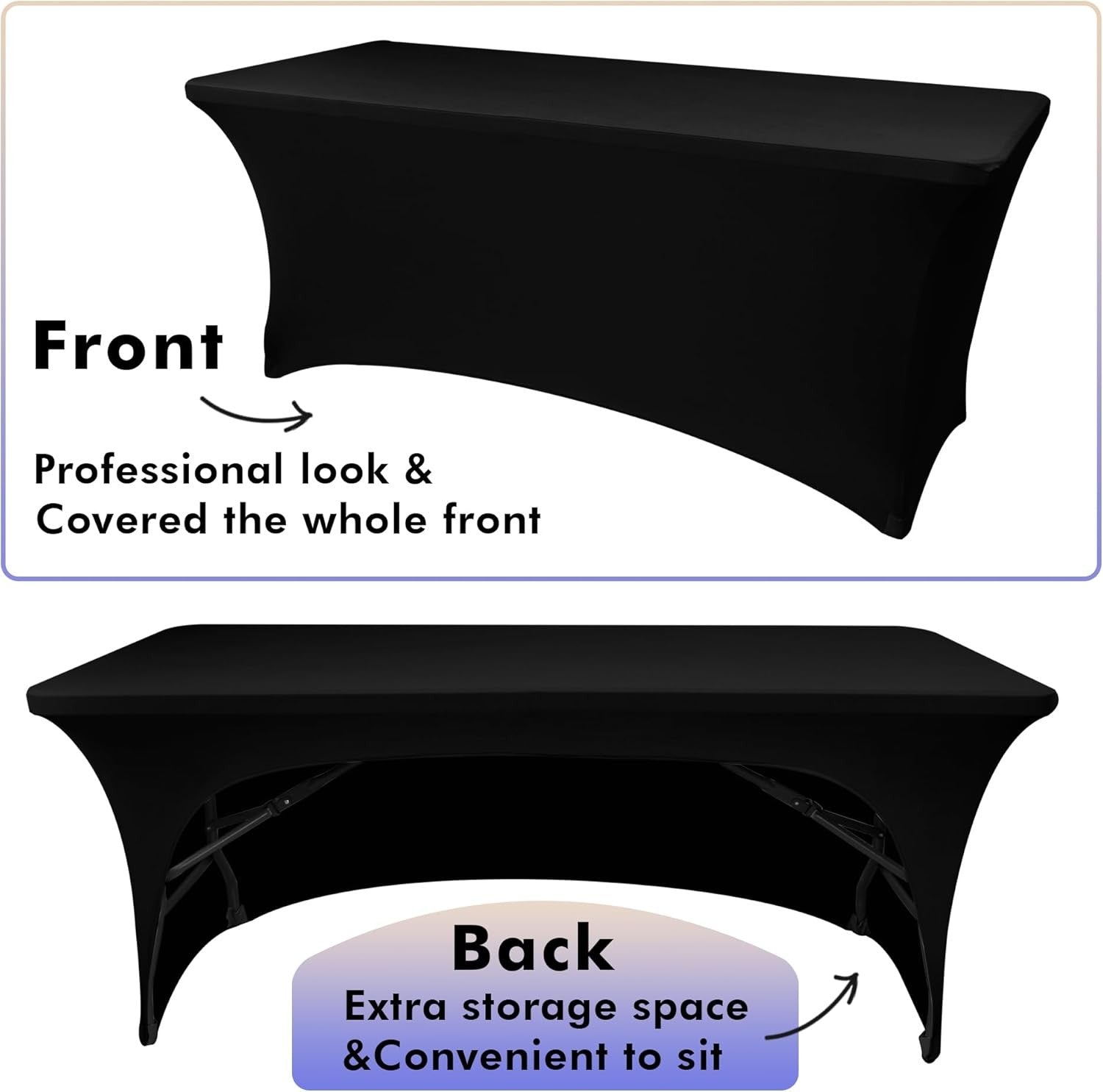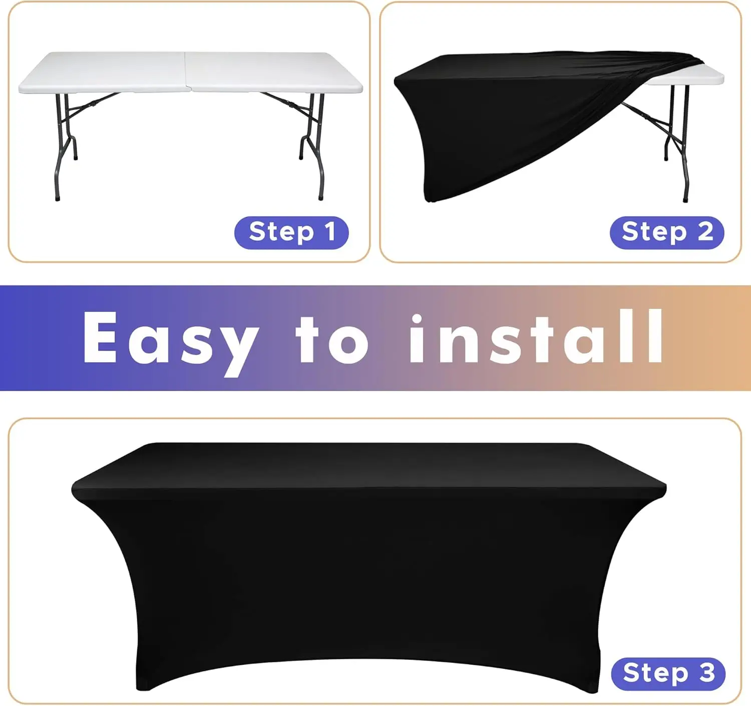 What's in Package: 1 black spandex tablecloth featuring 4 elastic sturdy foot pockets with open back design. Premium fitted table cover for rectangular tables,