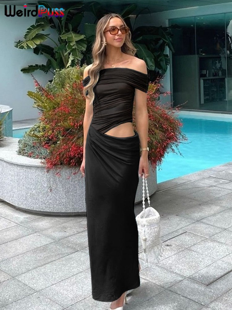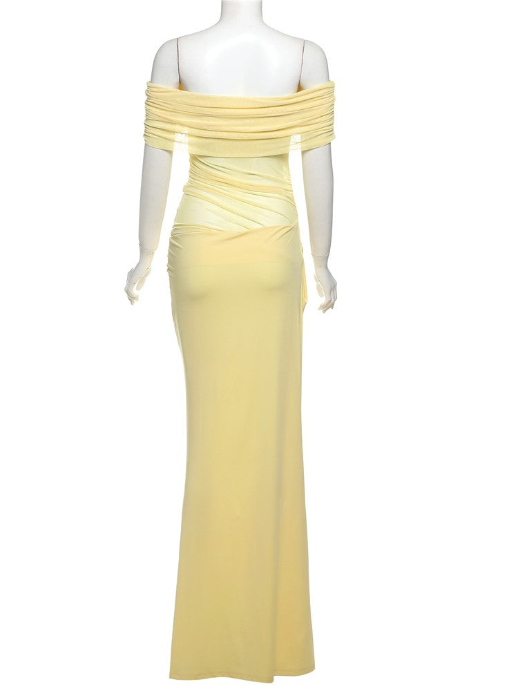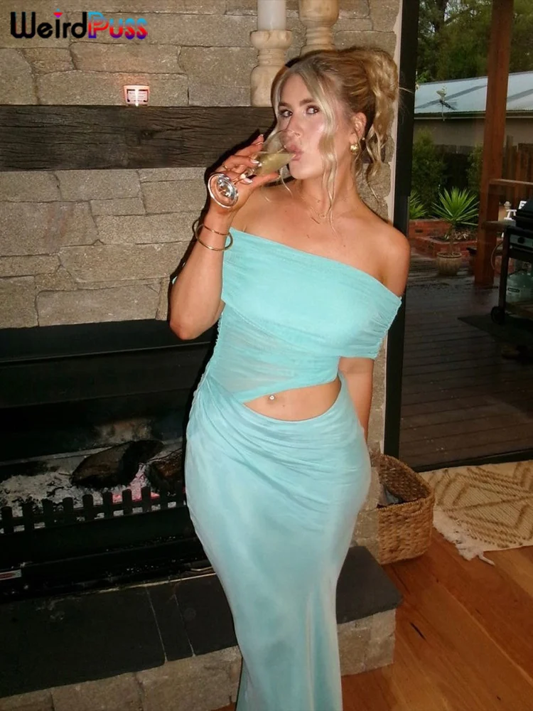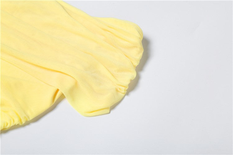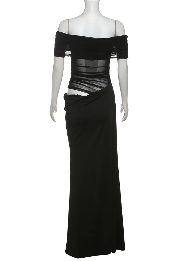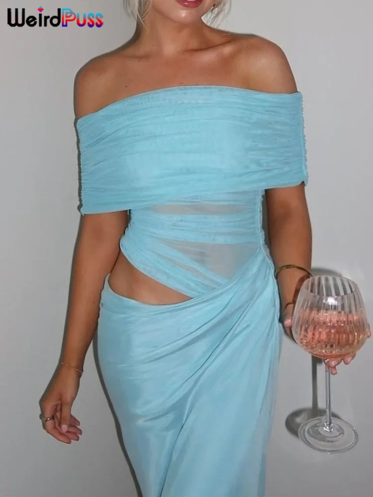 Weird Puss Ruched Irregular Dress Women Mesh Patchwork Slash Neck Short Sleeve S