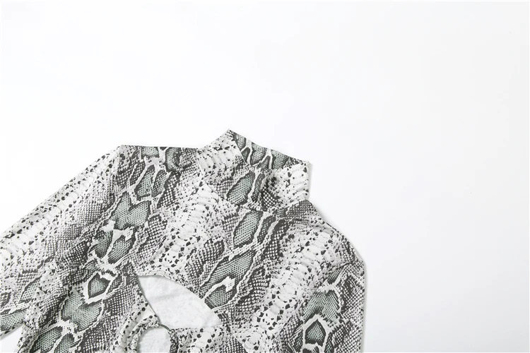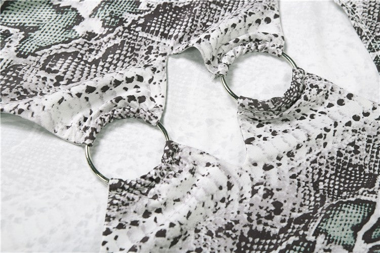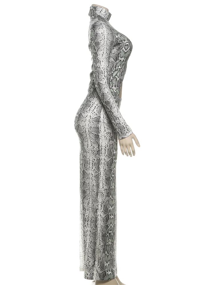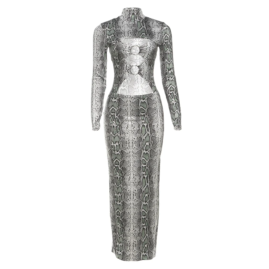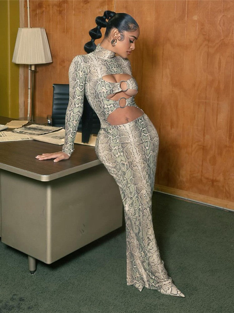 Weird Puss Sexy Snakeskin Maxi Dress Women Chest Hollow Metal Ring Turtleneck Peach Hip Hipster Street Stretch Skinny Bodycon
