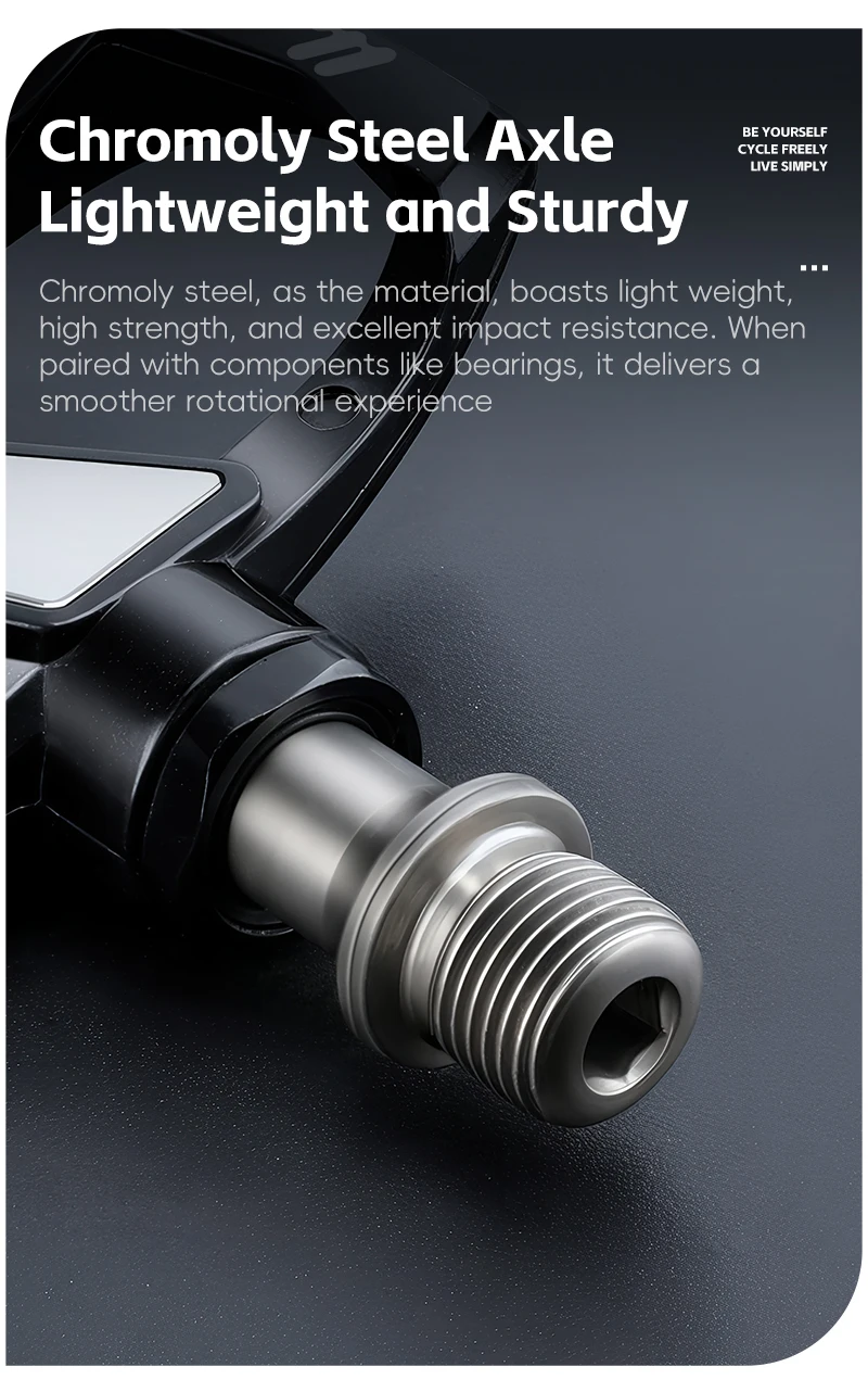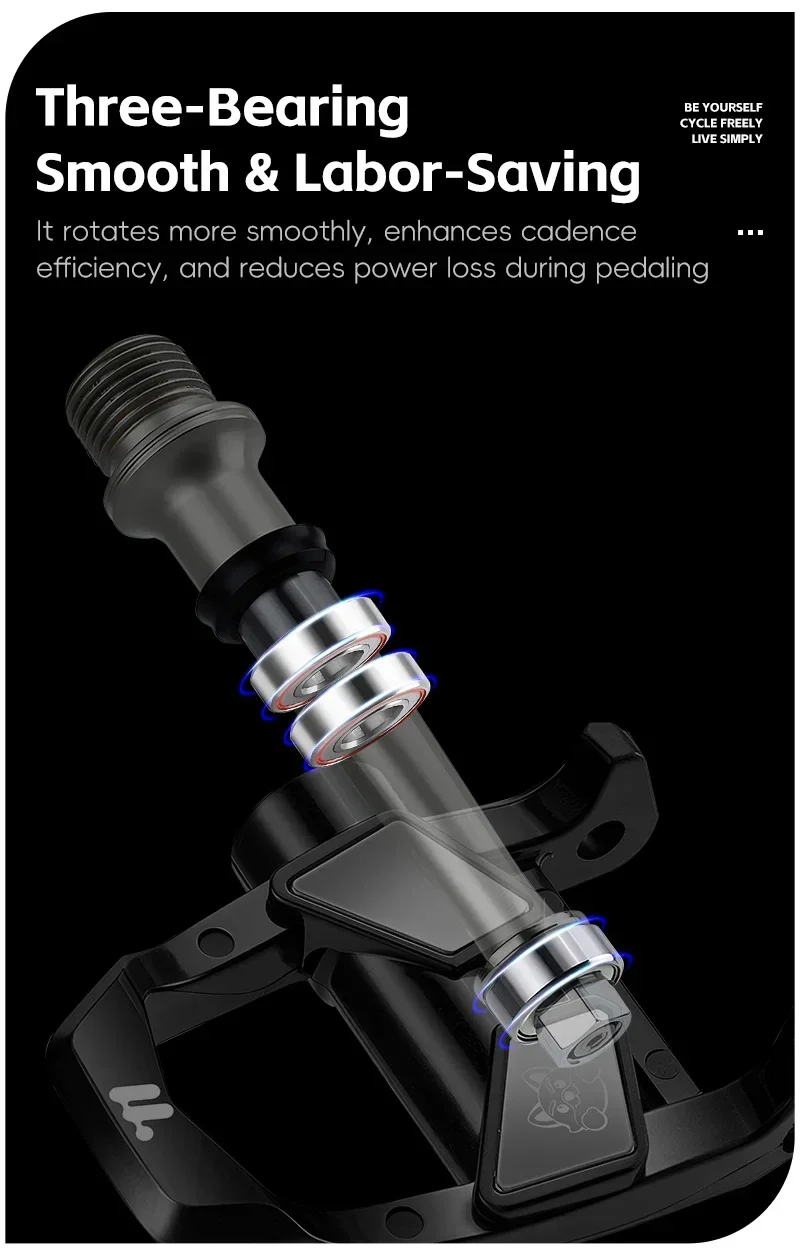 The WEST BIKING Road Bike Pedals feature a self-locking pedal design, ensuring secure footing during cycling.