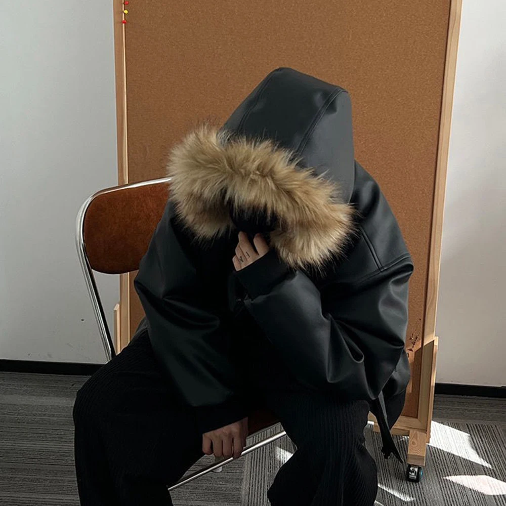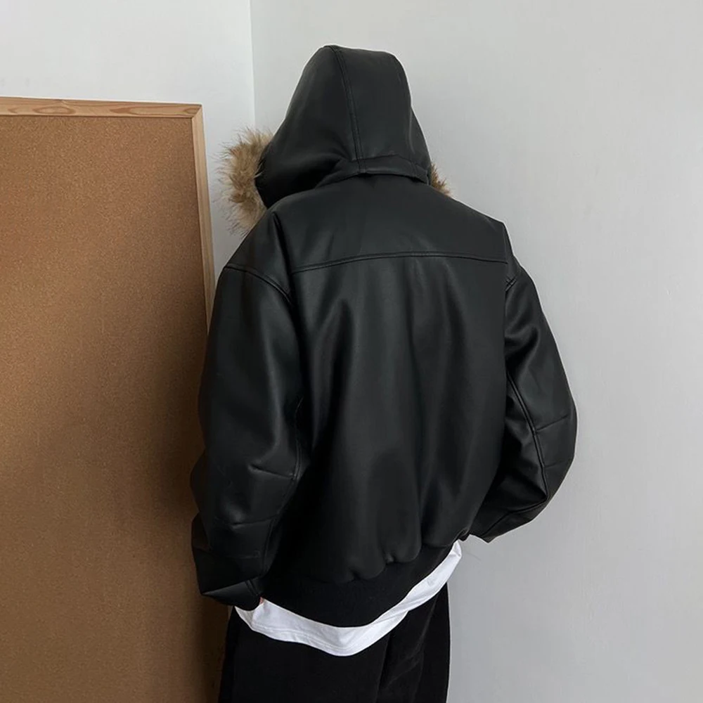 Winter American retro fashion brand handsome all-match warm detachable hat heavy PU leather cotton coat thickened jacket for men