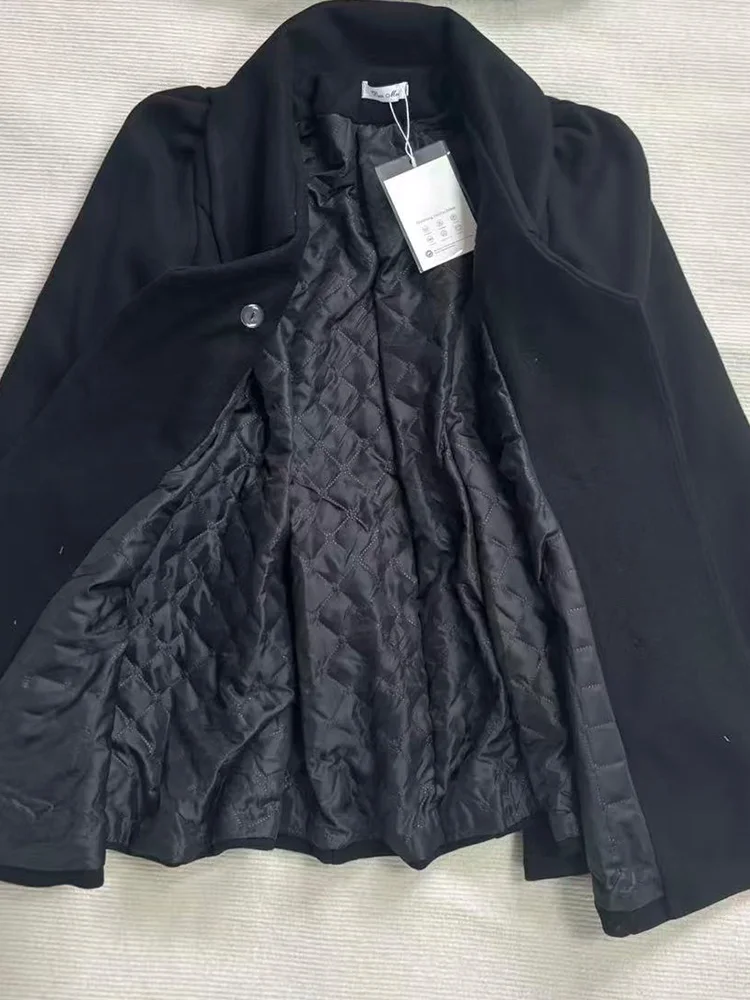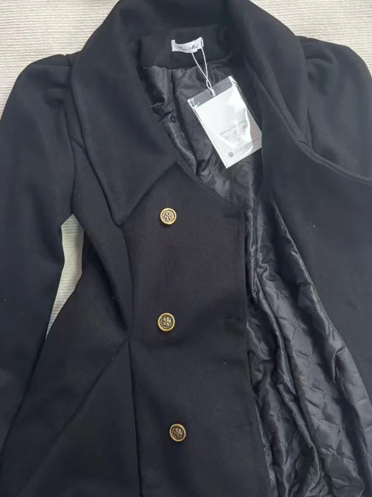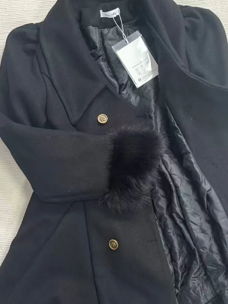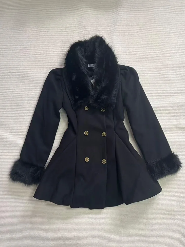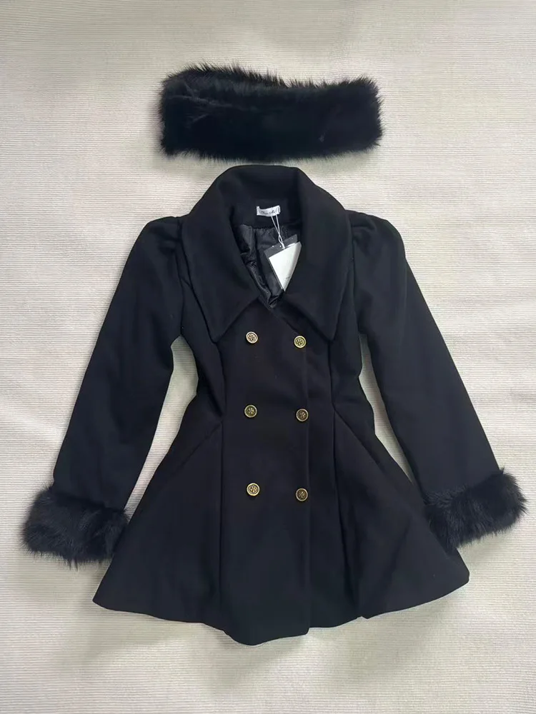 Winter Hepburn Black Fur Collar Woolen Coat French Style Vintage Blends Slim Mid-length Outwear Elegant Lolita Warm Outfits 2025