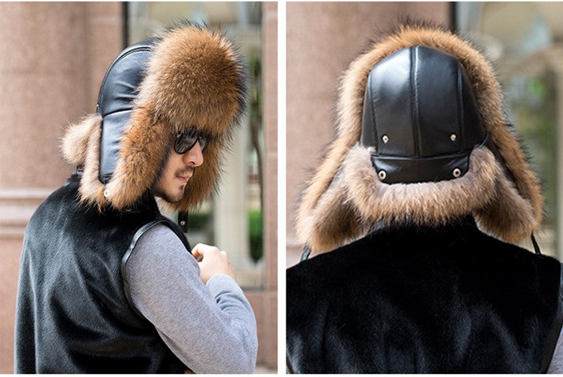Winter Men's 100% Real Silver Fox Fur Bomber Hat Raccoon Fur Ushanka Cap Trapper Russian Man Ski Hats Caps Real Leather