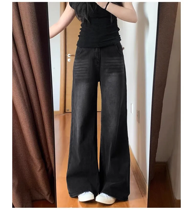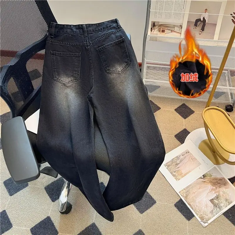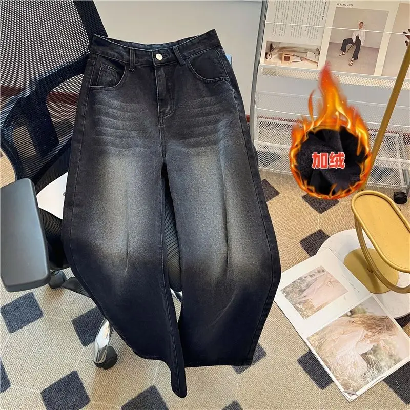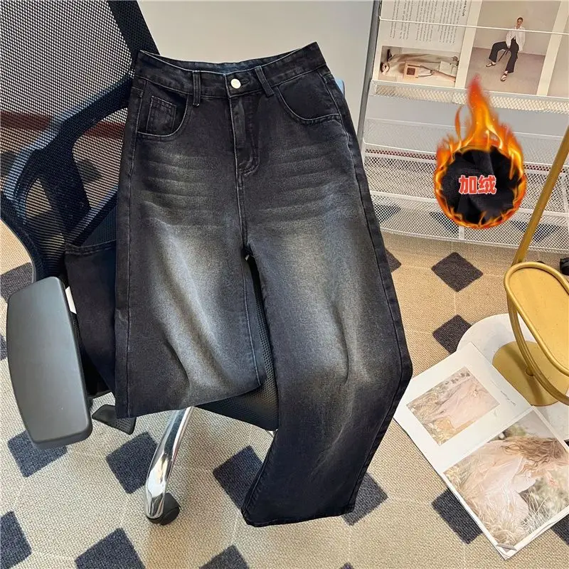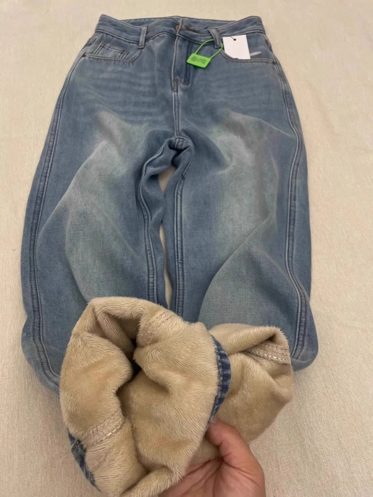 Winter Thick Women's Fleece Straight Jeans Casual Comfortable Soft Velvet Slim Pants Vintage Wide Plush Denim Trousers