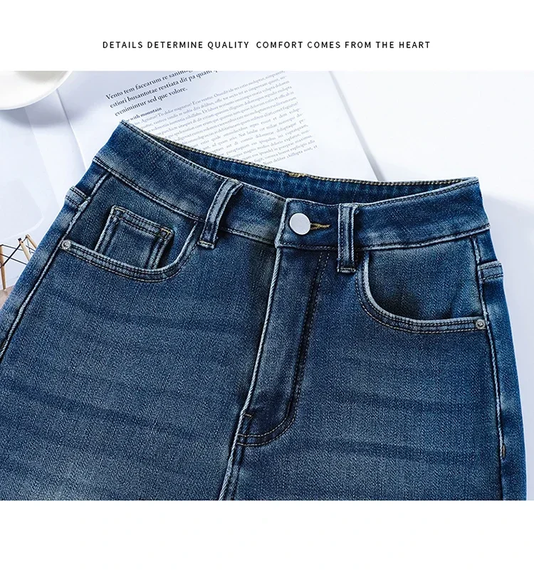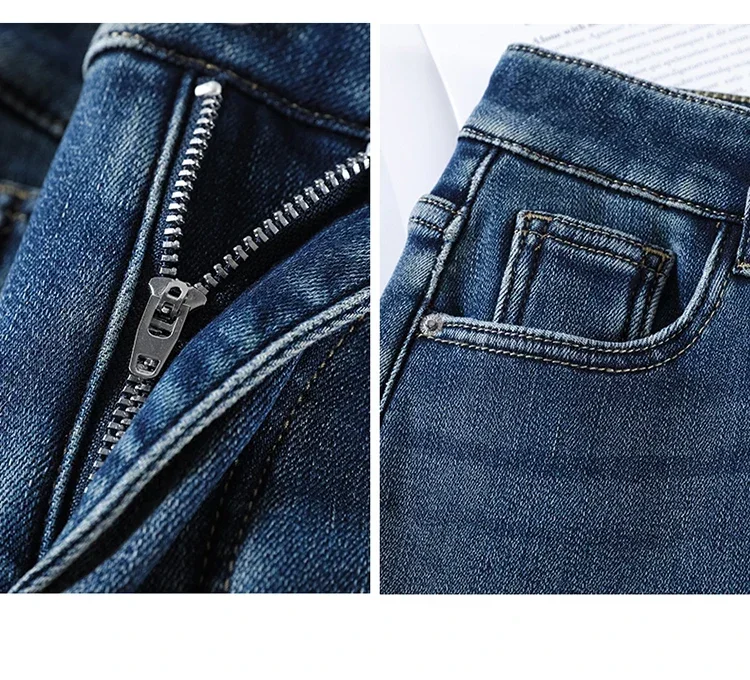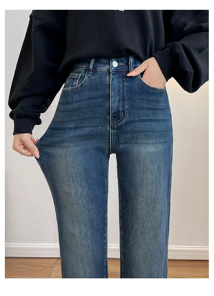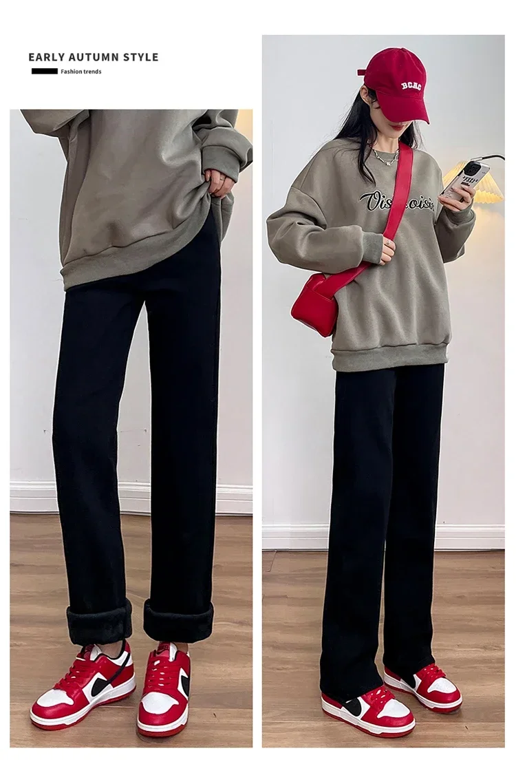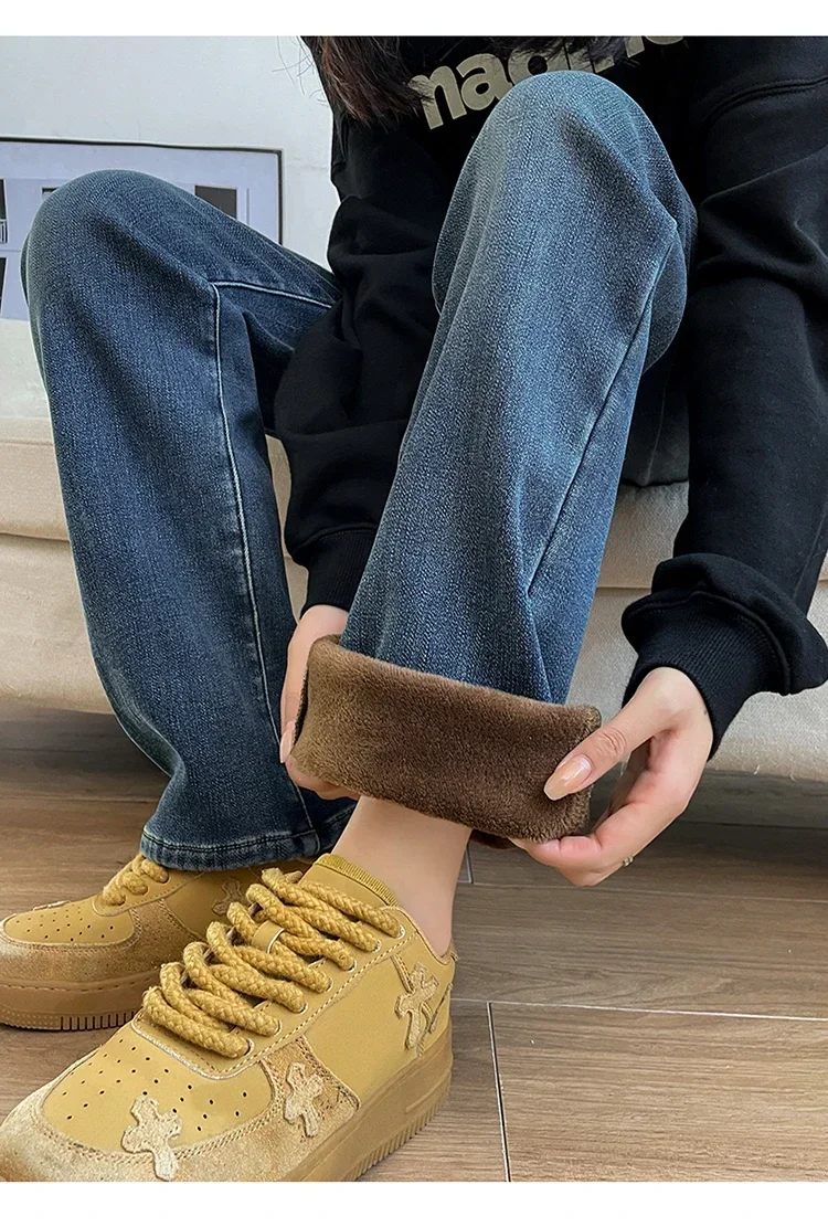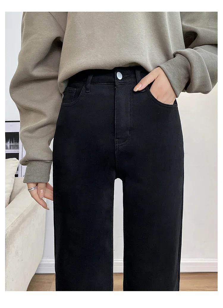 Winter Thickened Women's Mink Velvet Jeans Loose Straight Warm Soft Fleece Fashion Elastic High Waist Female Pants Black Blue