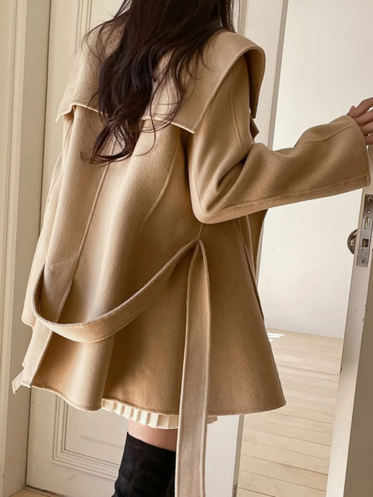 Winter Woolen Coat Women Chic Navy Collar Belted Waist Cinched Midi Length Tweed Trendy Korean Sle Commute Long Sve