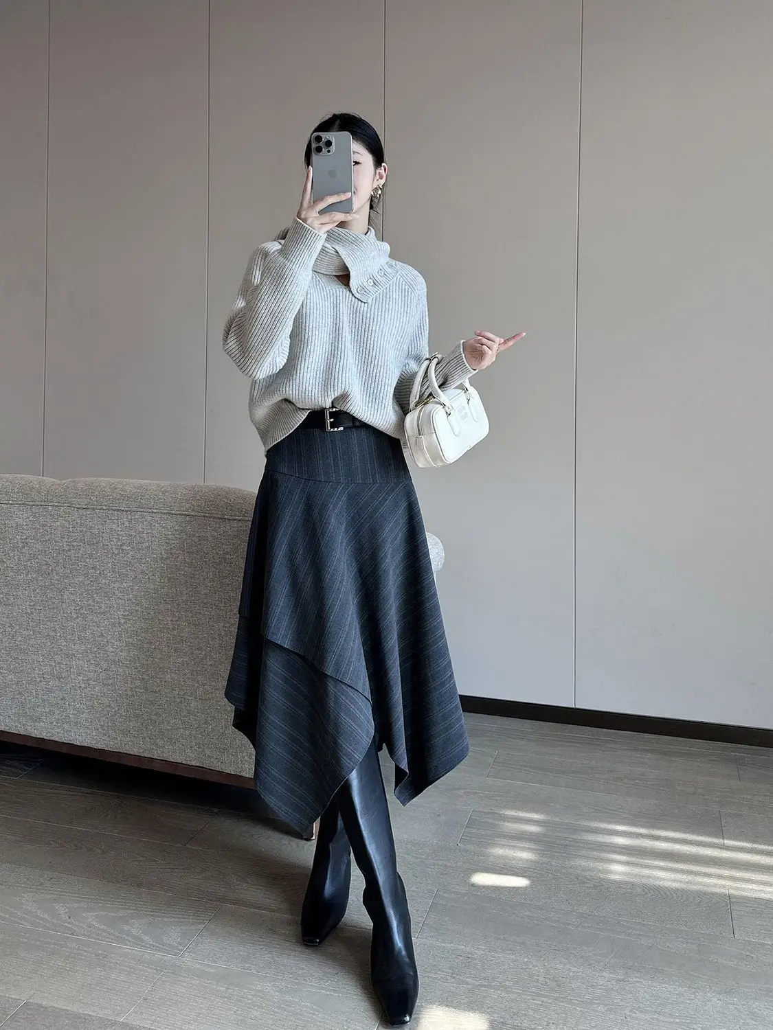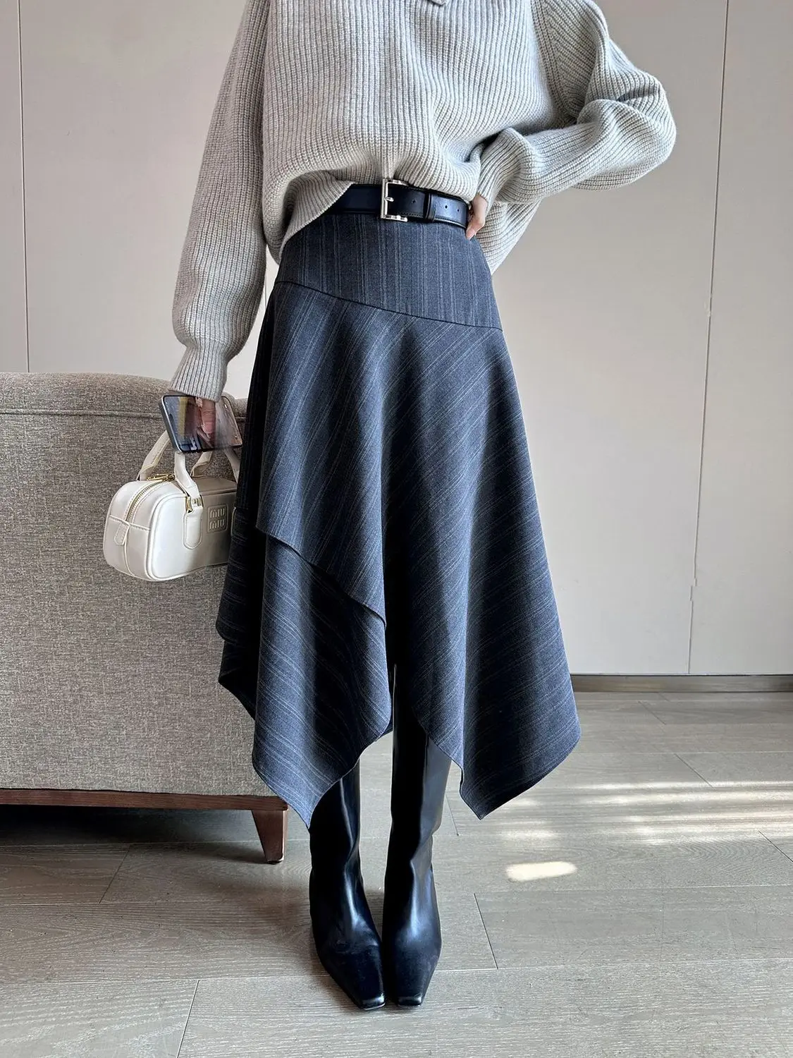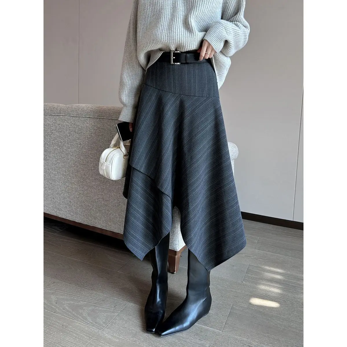 Women Clothing Autumn Winter Fashion Korean Striped A-line Skirt High Waist Female Versatile Appear Thin Irregular Soft Skirt