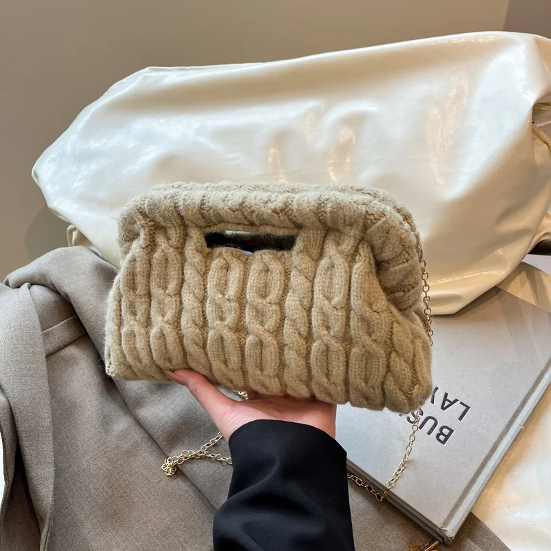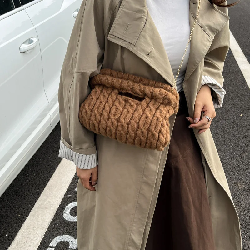 Women Knitting Chain Shoulder Bags Trend Crochet Clutch Purse Plush Cloud Handbags Autumn Winter Travel Daily Crossbody Bags