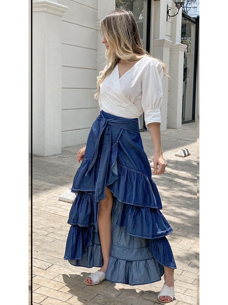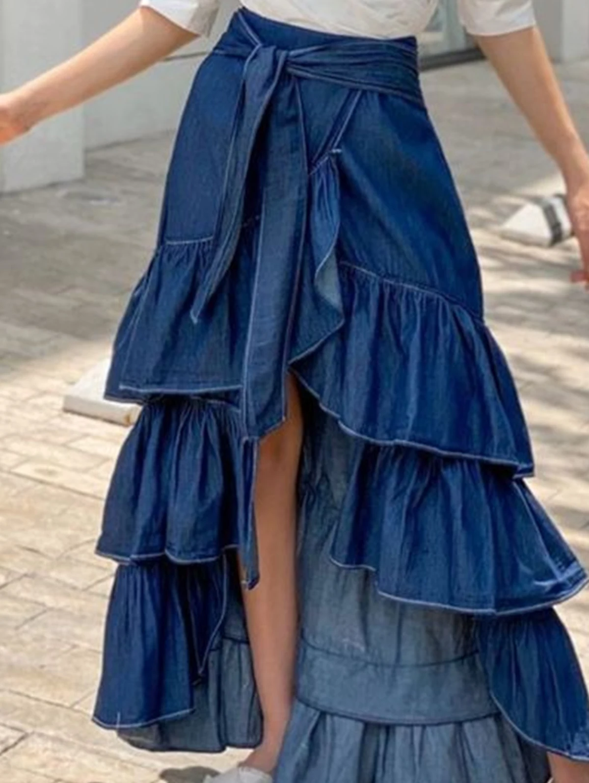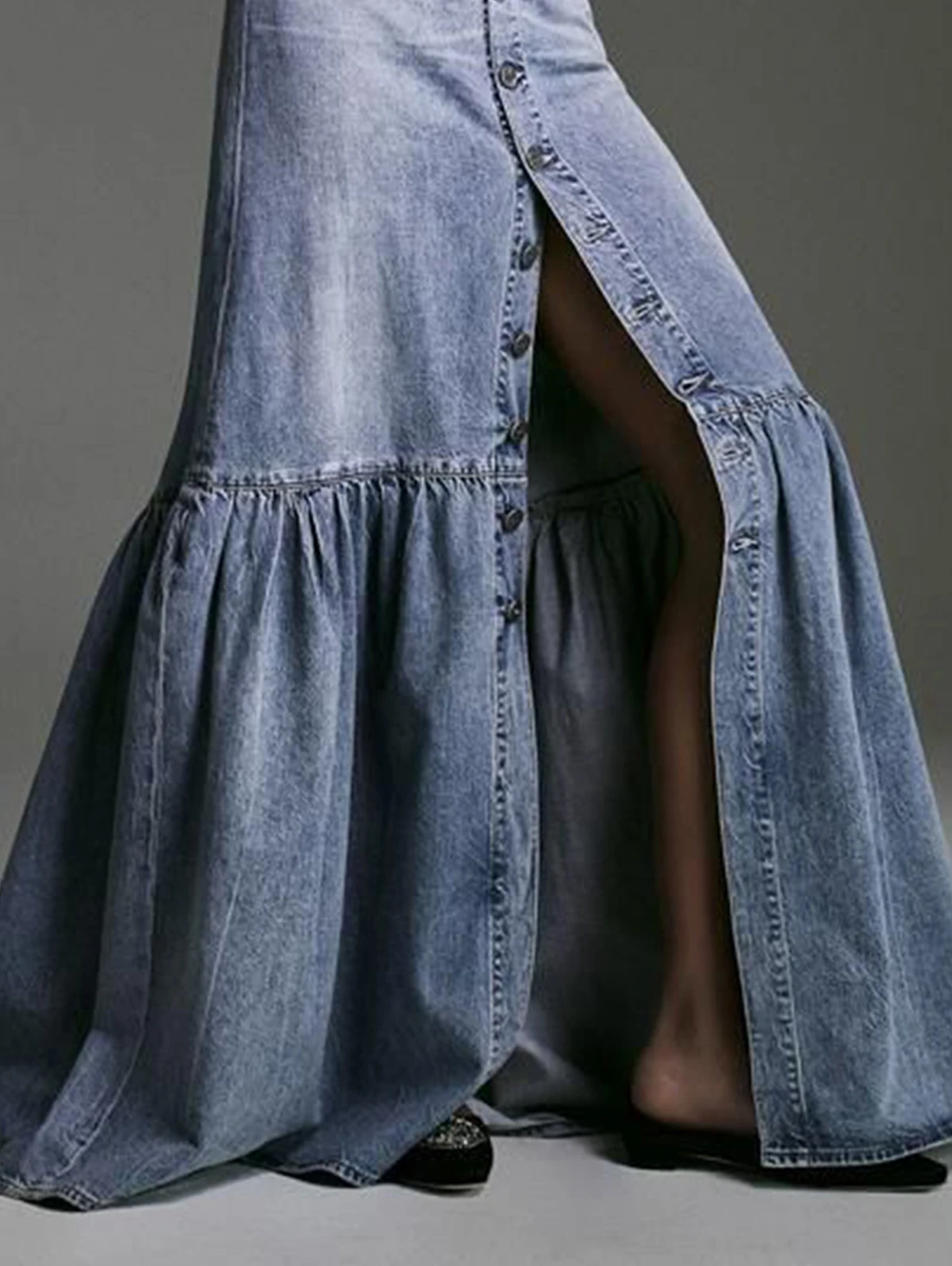 Women Mermaid Skirt Plus Size High Waist Casual Plain Spliced Pleated Slit Hem Denim Skirt Single Button Slim Vintage Skirt 2023