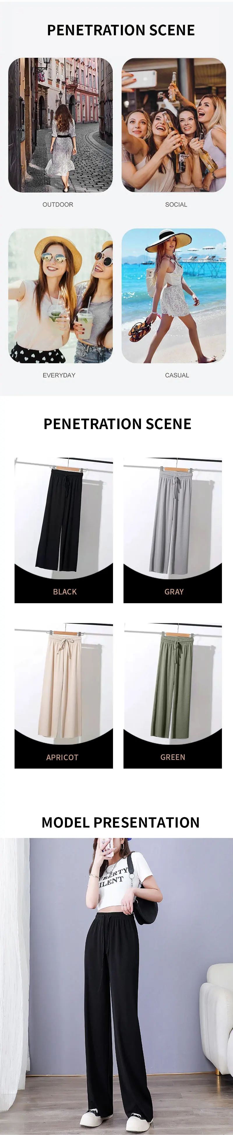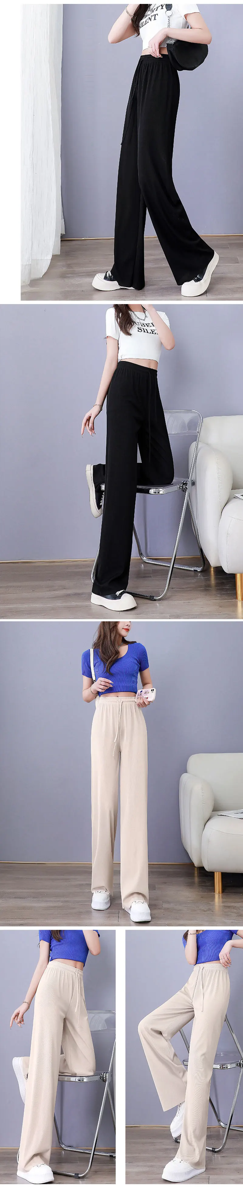 Adopting the top ice silk fabric, light and breathable, with a silky smooth touch, you can enjoy a cool experience like a spring breeze even on hot summer days. The unique fiber structure effectively absorbs moisture and perspiration, keeping you dry and comfortable every step of the way. The loose, straight-legged pants are very inclusive of leg types, whether O-leg or X-leg, can be easily managed, showing a casual and unrestrained fashion attitude. The pants are naturally draped, so you can walk in style and show off your elegance.