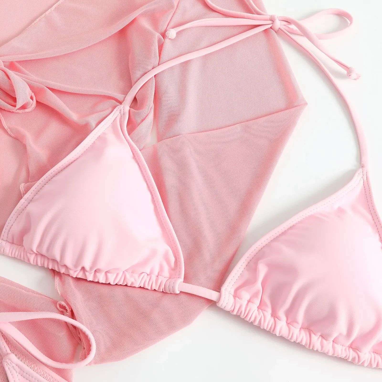 Women Pink Micro Mini String Bikini Sets 4 Pieces with Mesh Cover Tops and Skirt Swimsuit Bathing Suit Beach Outfits Biquini