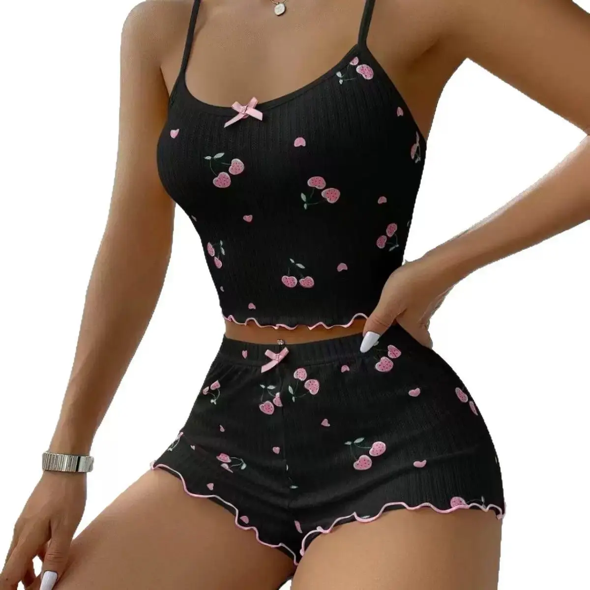 Women’s Summer Pajama Set – Heart Print Ribbed Backless Crop Top & Shorts with Bow Detail