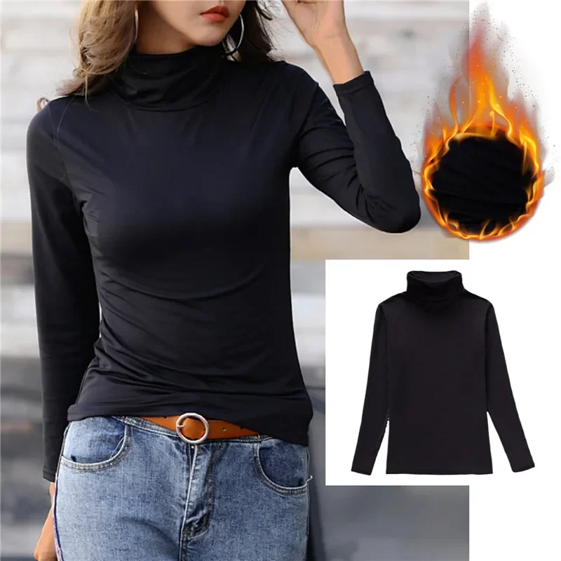 Women Thermal Underwear Winter Turtleneck Bottom Shirt Solid Semi High Collar Long Sleeve Basic T-Shirt Heating Fiber Pullovers