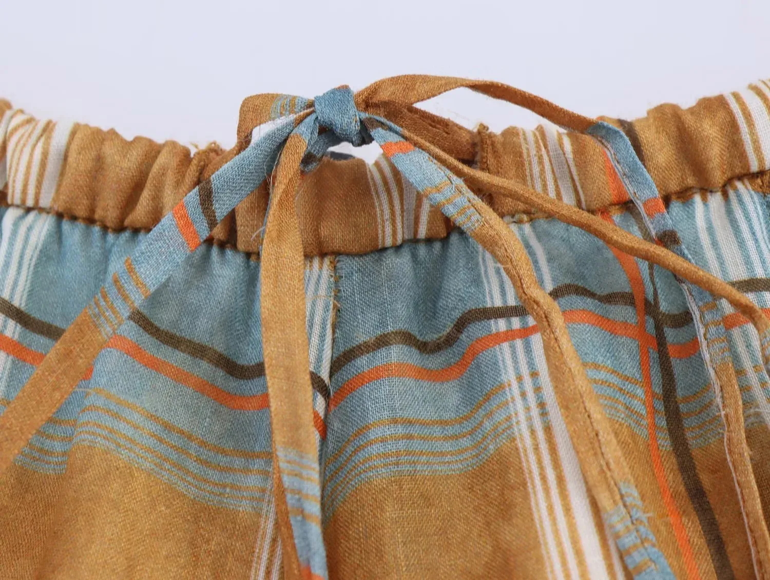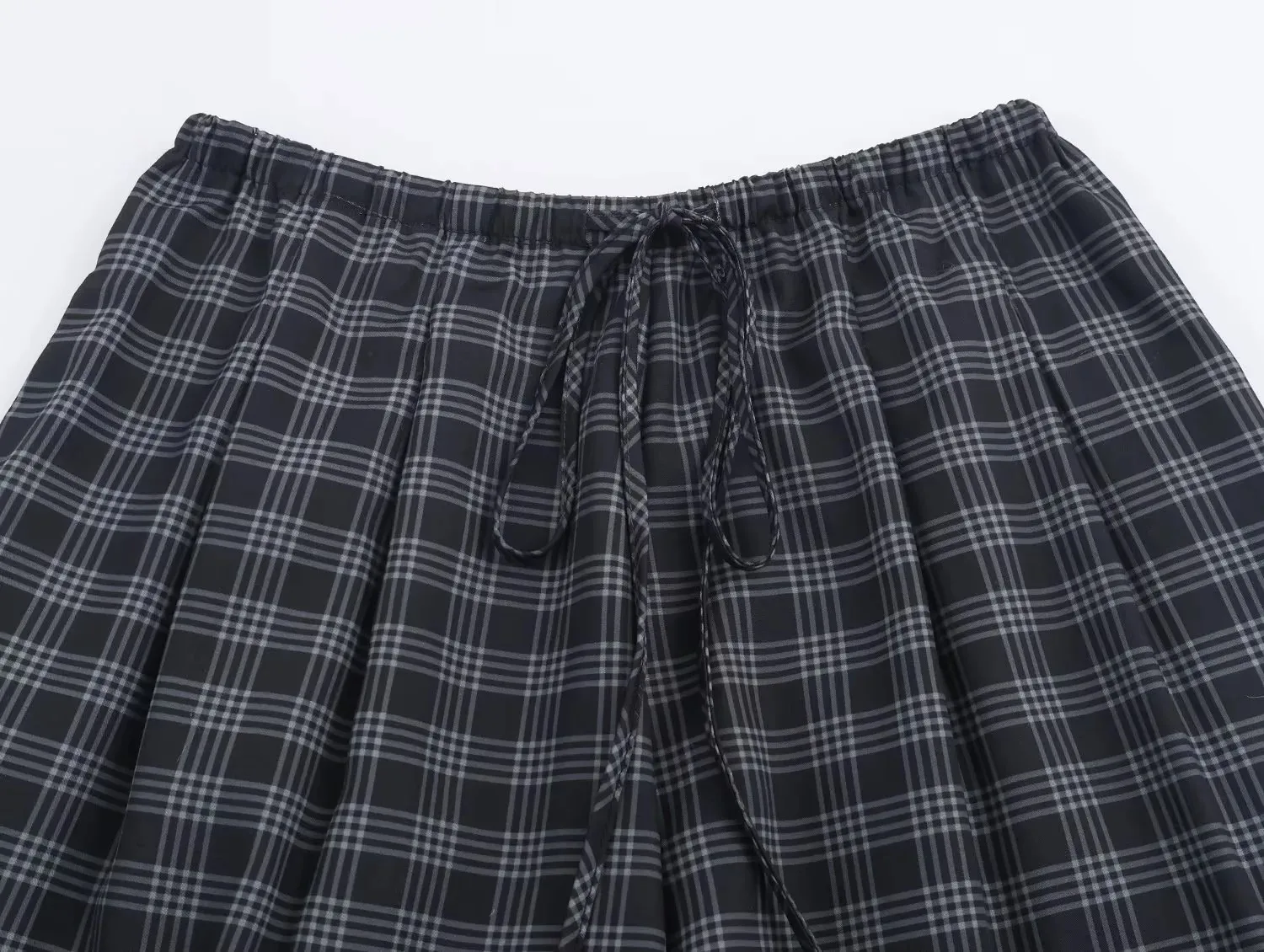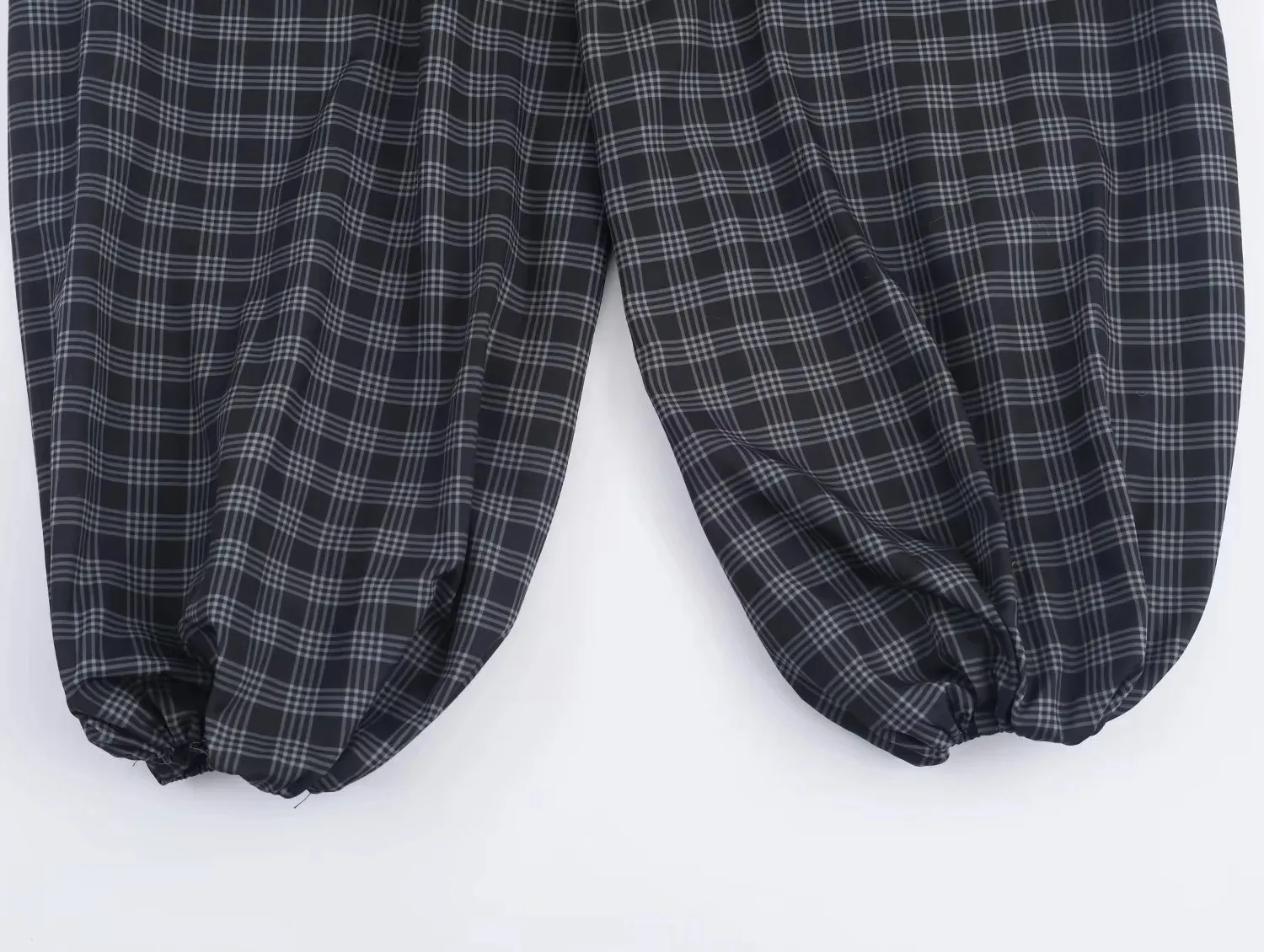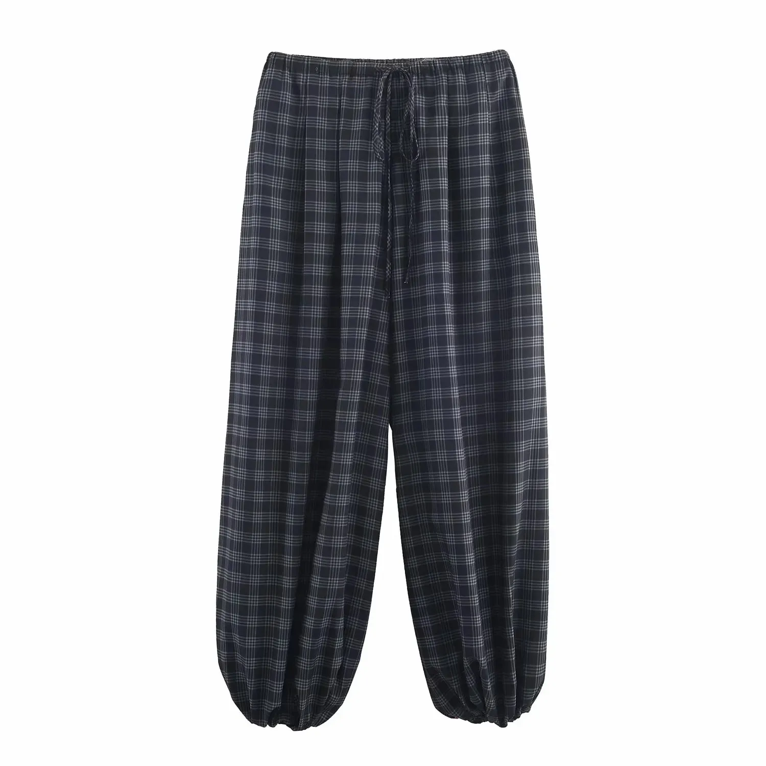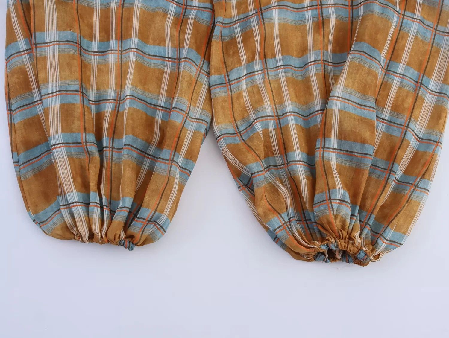 Women's 2025 Autumn Fashion Versatile Ramie Bloomers Plaid Printed Loose Pants Female High-Waist Drawstring Casual Trousers