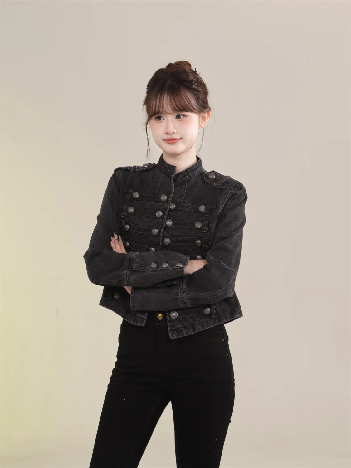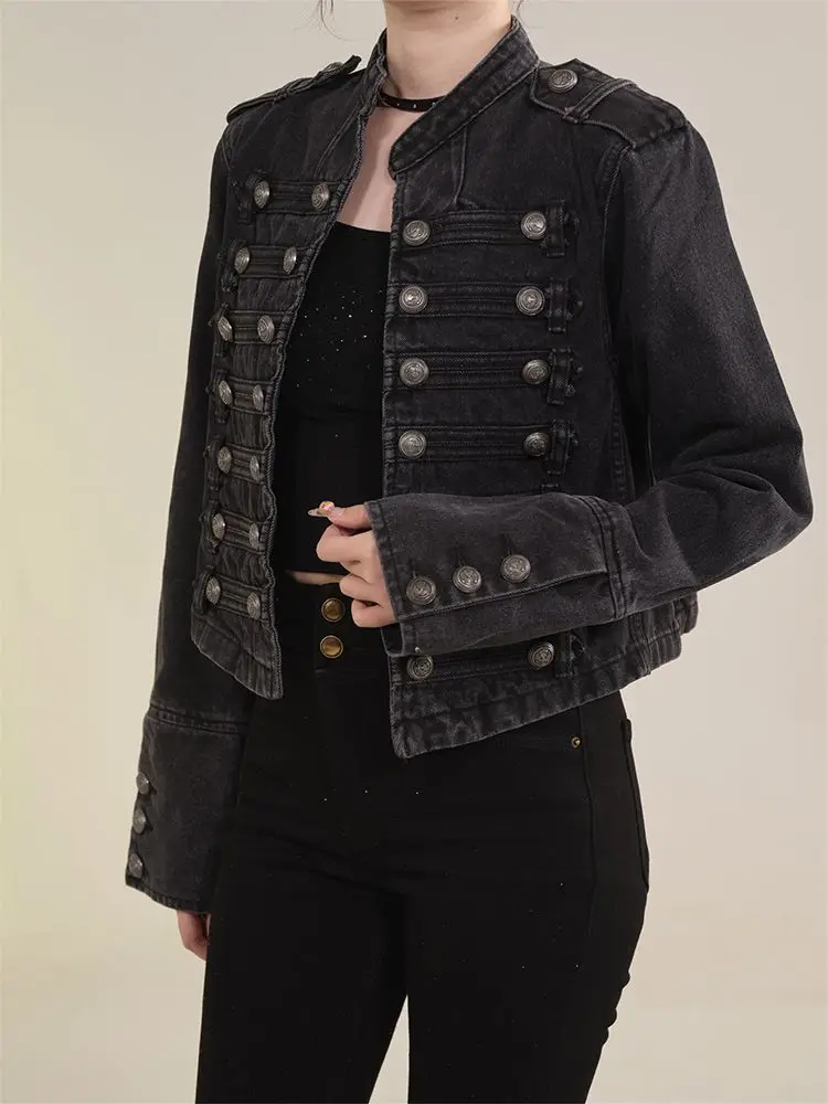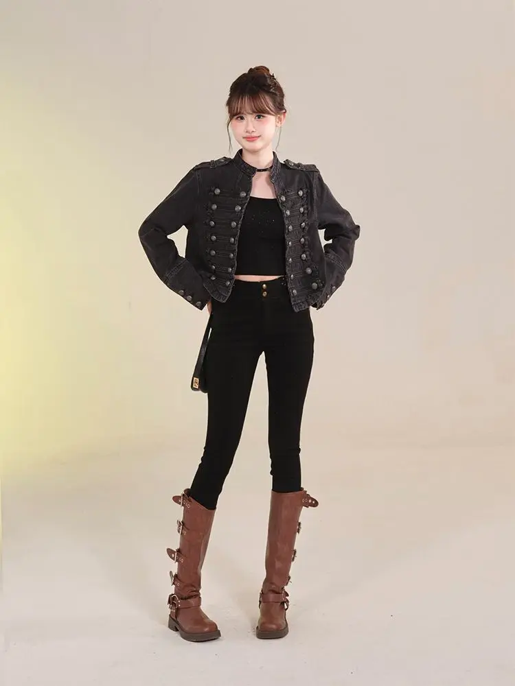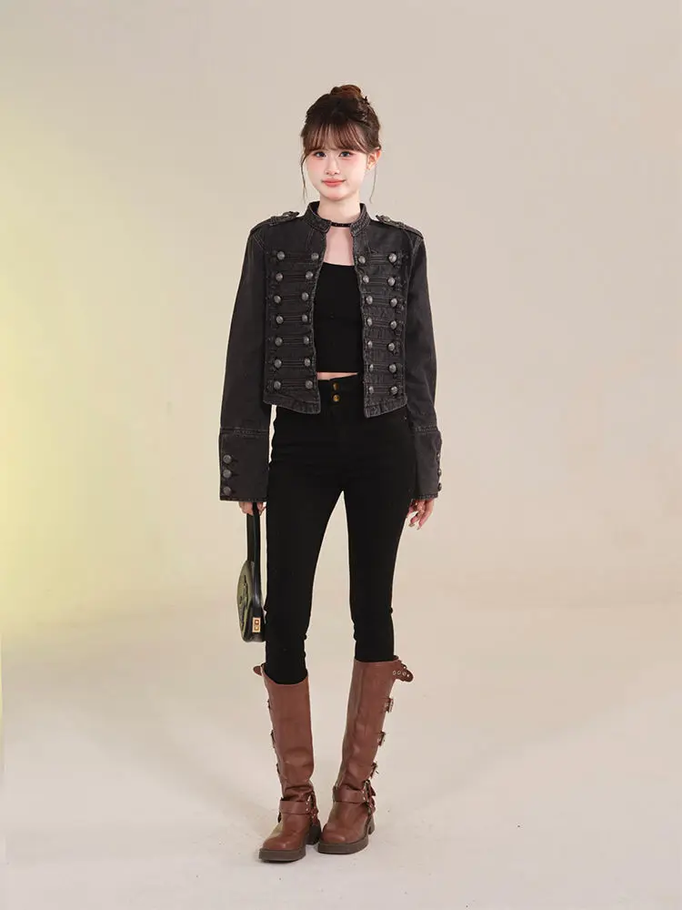 Women's American Retro Denim Military Inspired Cropped Jacket Long Sleeve Stand Collar Casual Motorcycle Coat