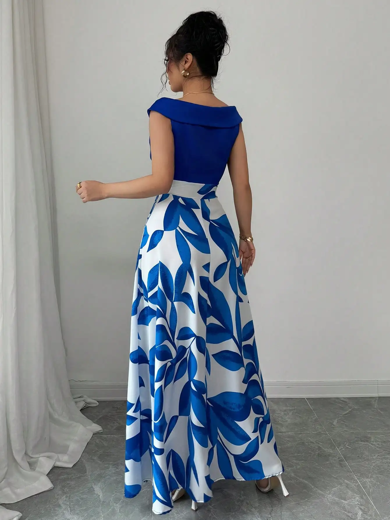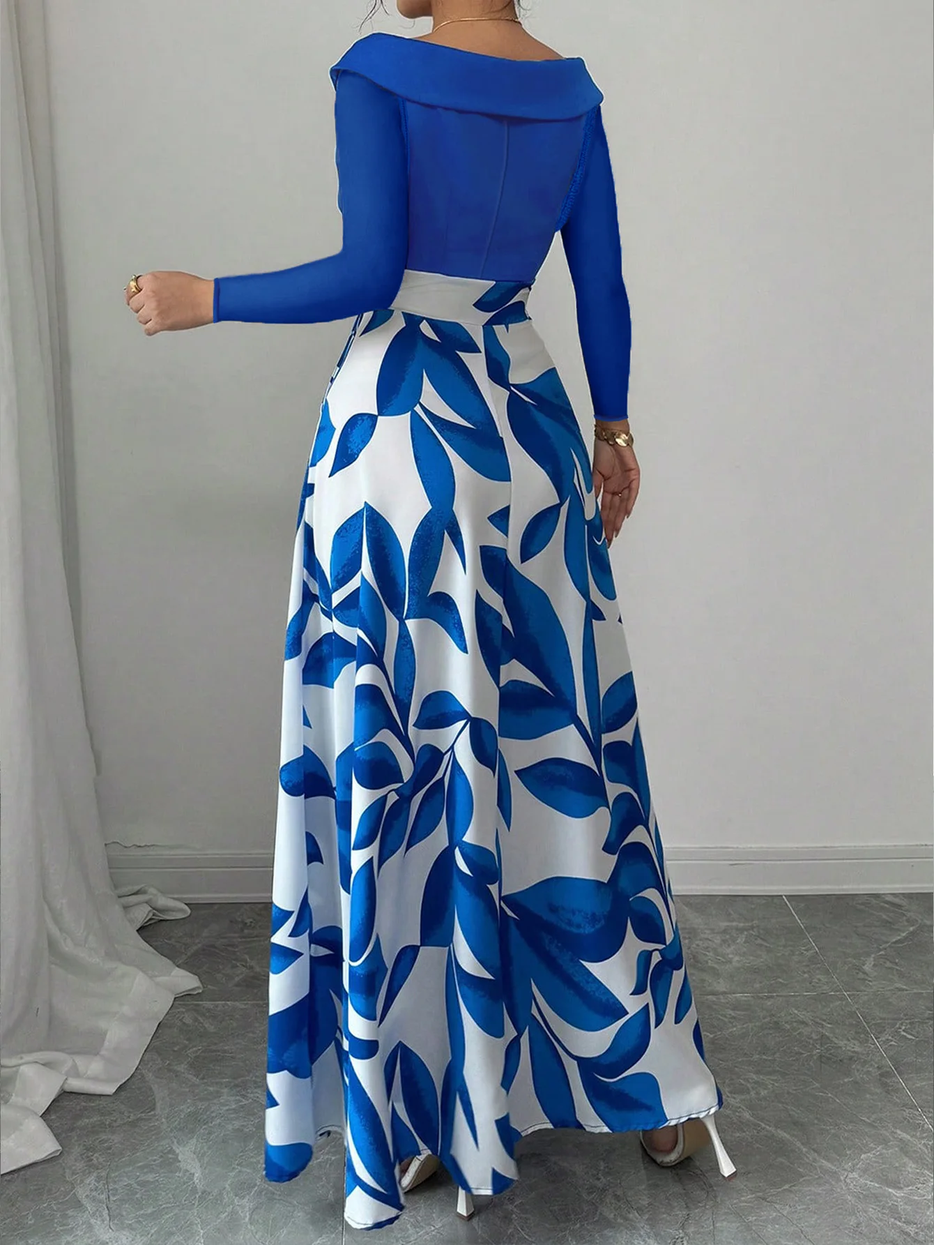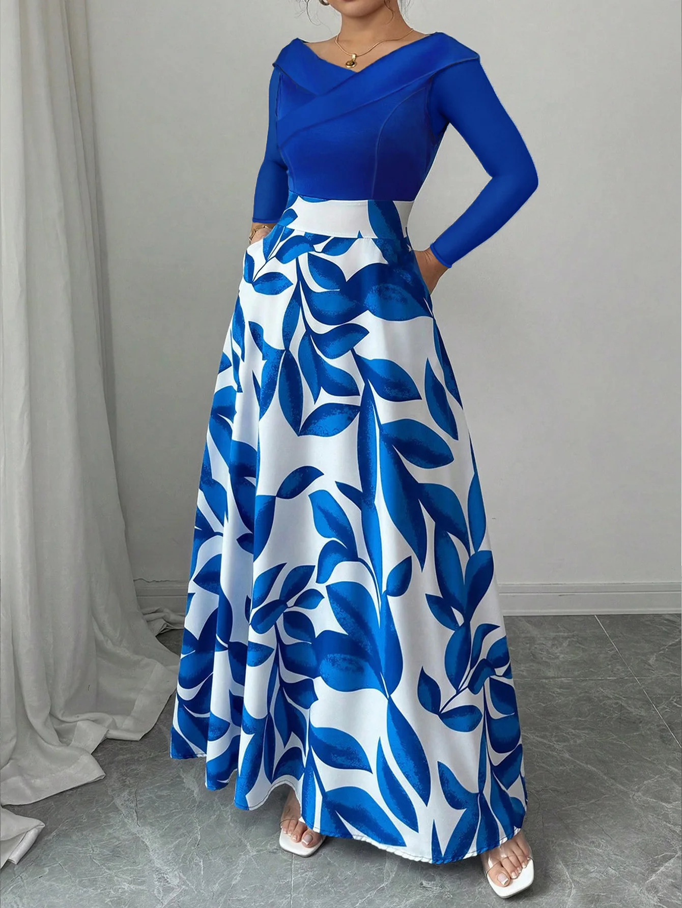 Women's Blue White Floral Maxi Dress Asymmetric Neckline Color Block Design Ideal for Evening Events Garden Parties Elegant Styl