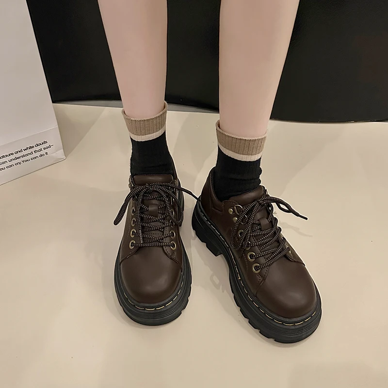 Womens Derby Shoes Autumn British Style Female Footwear Loafers With Fur Round Toe Clogs Platform Casual Sneaker Leather Fall Pr