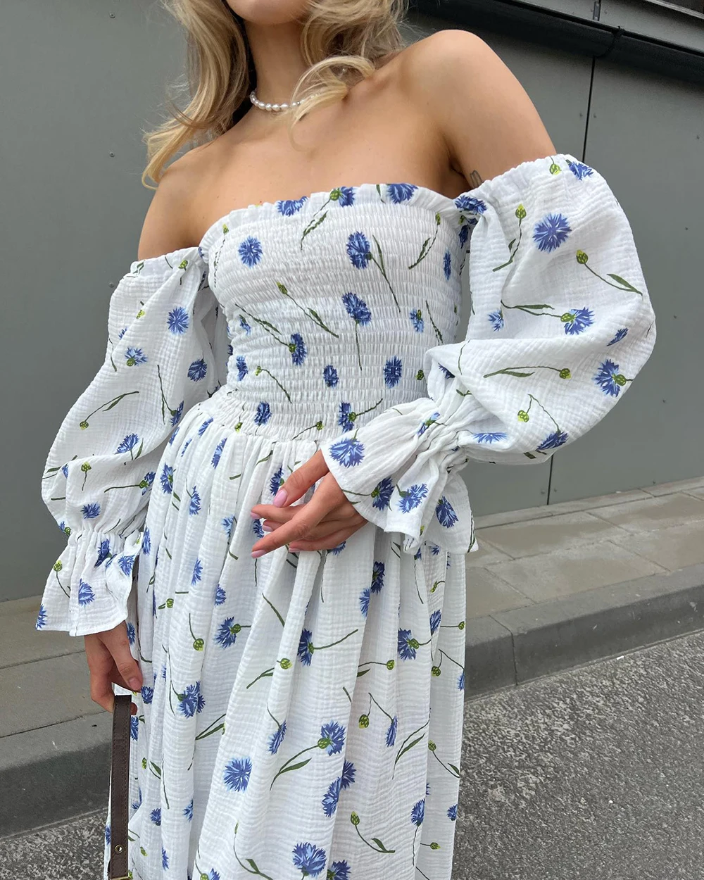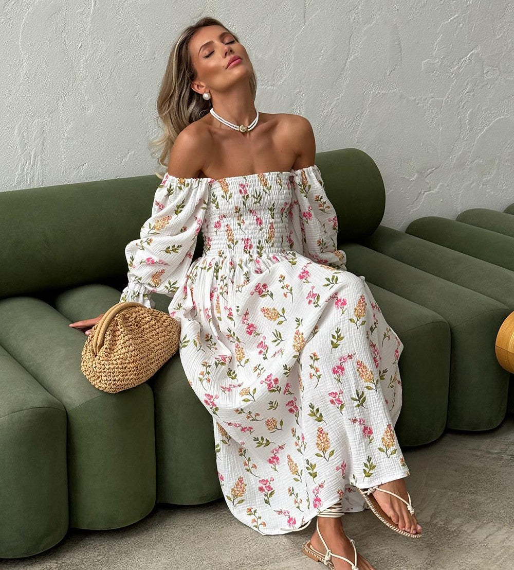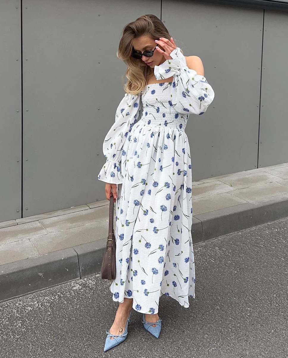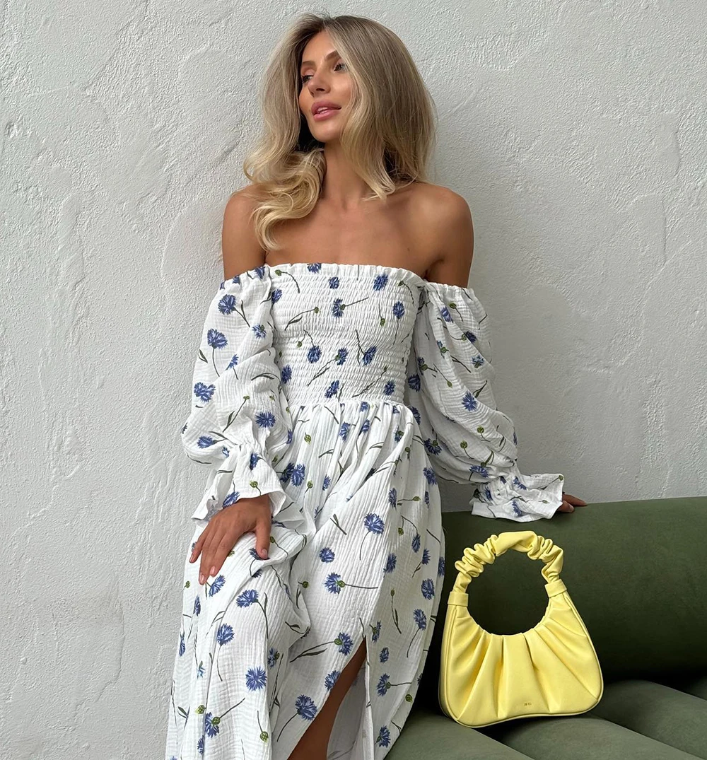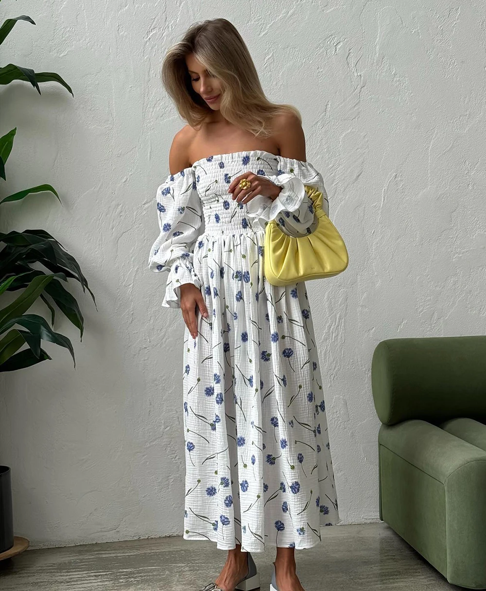 Women's Summer Cotton Dress 100% Elegant Ruffle Midi Floral Print Dress with Sid