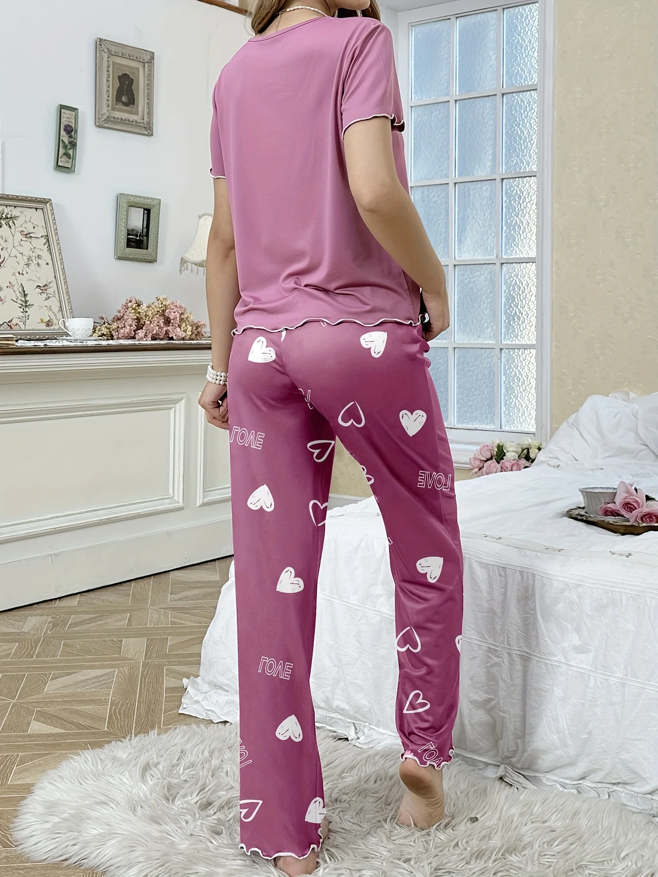 Women's Sweet and Romantic Lace Patchwork Spring and Summer Pajamas, Pink Heart Print Bow Tie Pajama Set