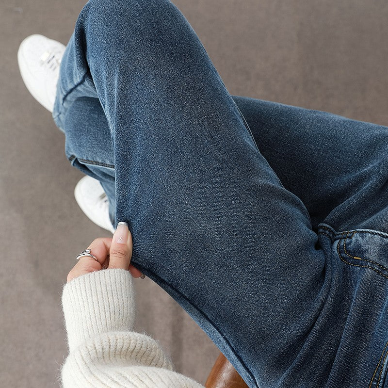 Women's Winter Fleece Warm Jeans Retro Elastic Thickened Comfortable Straight Fashion Korean Casual Female Velvet Denim Pants