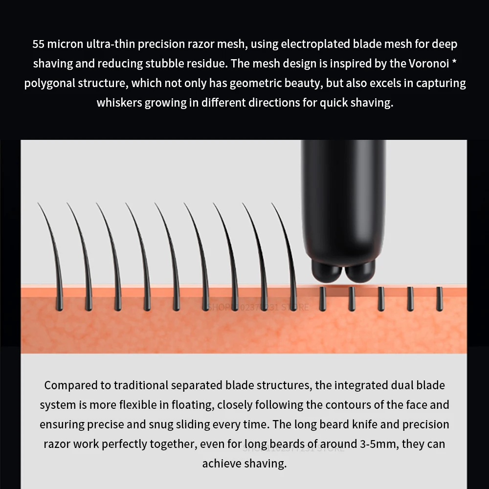 The integrated floating dual-blade system is more flexible than the traditional separate blade system, allowing the shaver head to tackle even the most complex facial contours, ensuring precision and comfort. The blade for long hairs and the precision blade perfectly complement each other to cleanly shave hairs as long as 3–5mm.