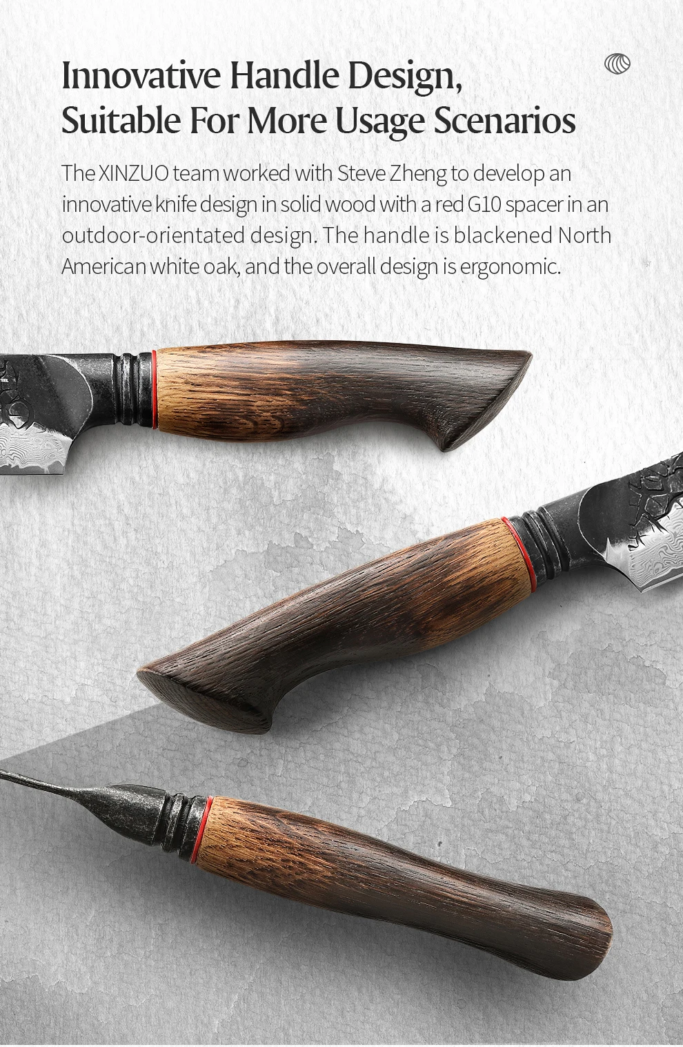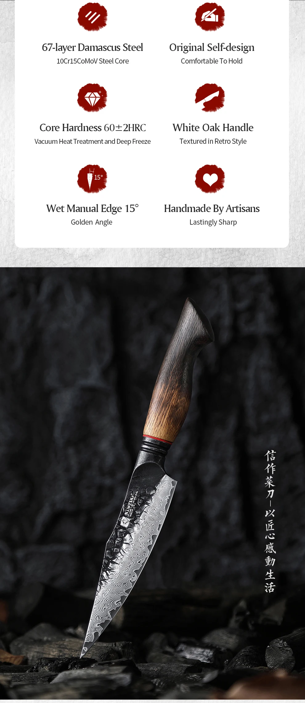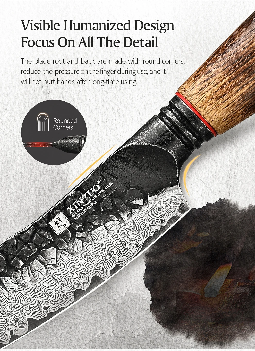 XINZUO 5.5" utility knife, 67 - Layer Damascus Masterpiece, forged with super steel, offers unrivaled sharpness and durability.