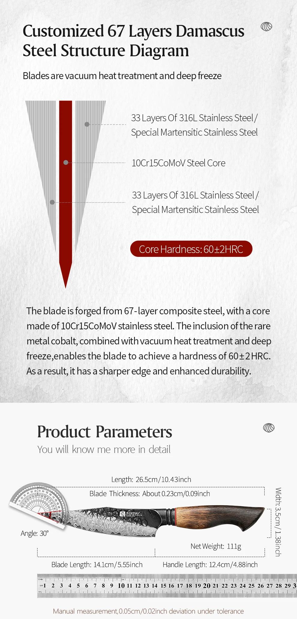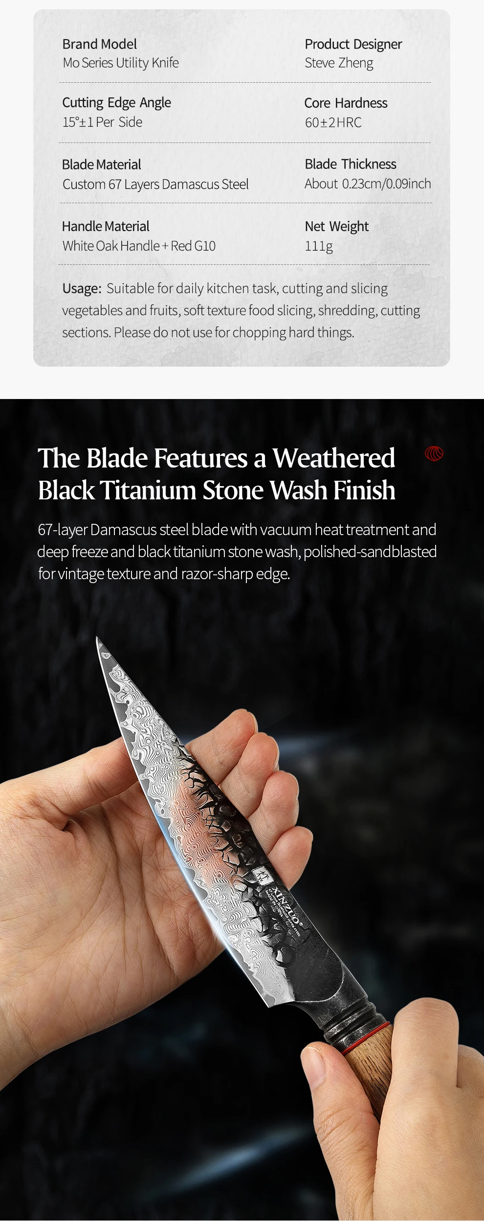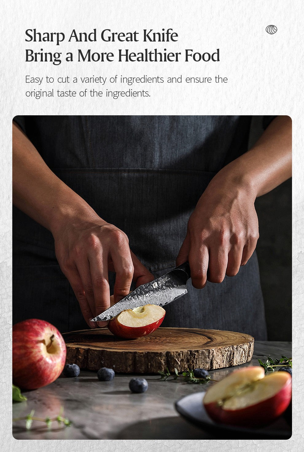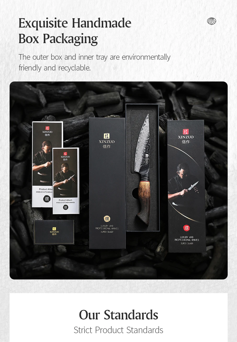 XINZUO 5.5" utility knife, 67 - Layer Damascus Masterpiece, forged with super steel, offers unrivaled sharpness and durability.