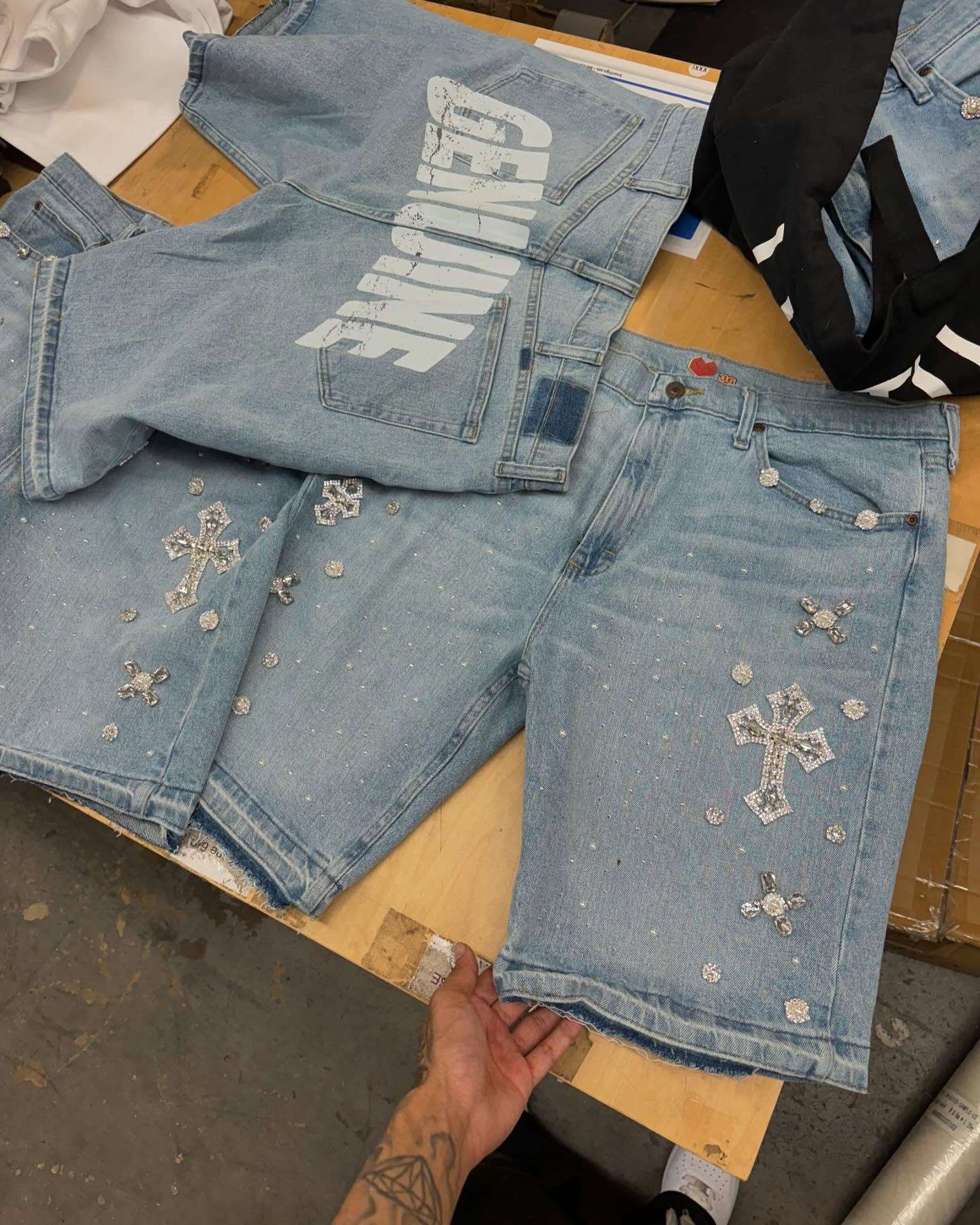 Y2K Gothic Diamond Cross Embroidery Denim Shorts American Retro Blue Gym Shorts Rhinestone Streetwear Hip Hop Men Women Jorts
