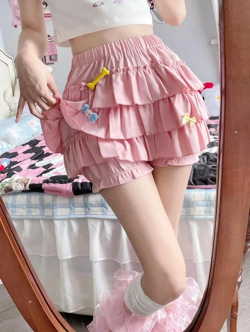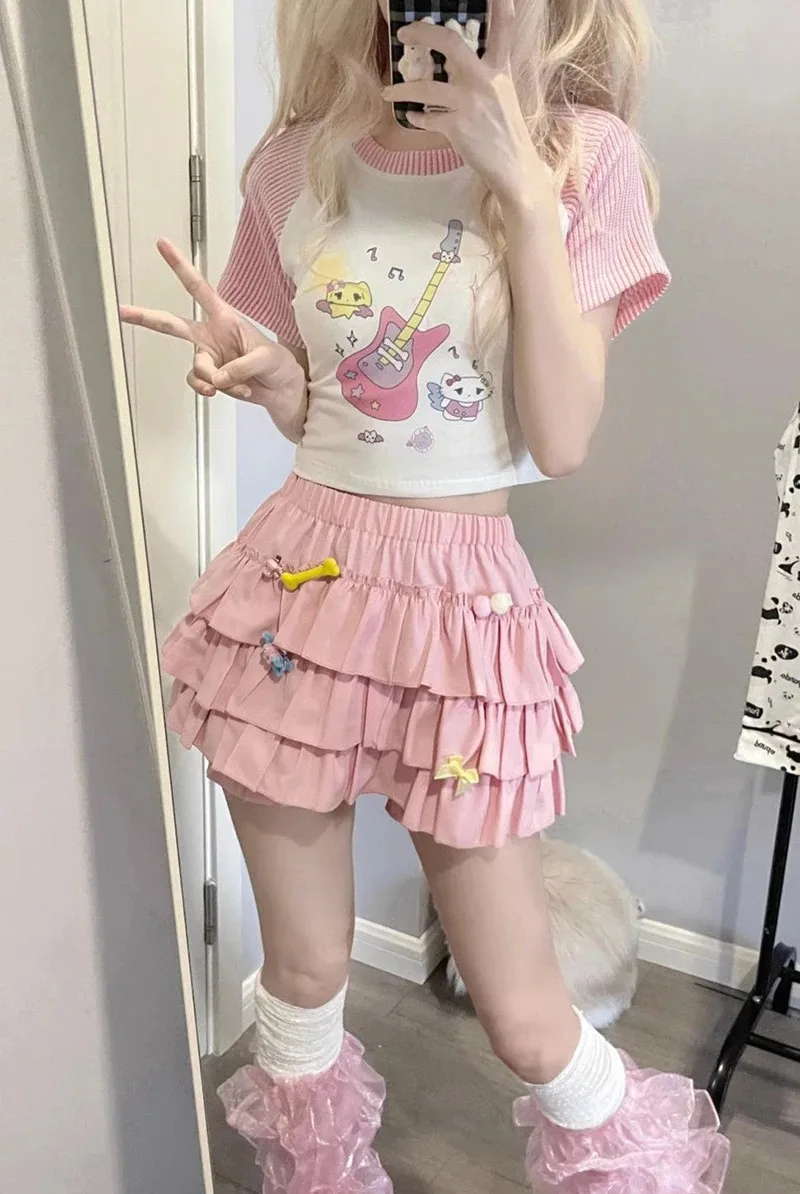 Y2K Sweet Ruffles Mini Skirt Women Kawaii Lolita Bow A Line Skirts Harajuku Japanese High Waist Pink White Ball Gown Skirt