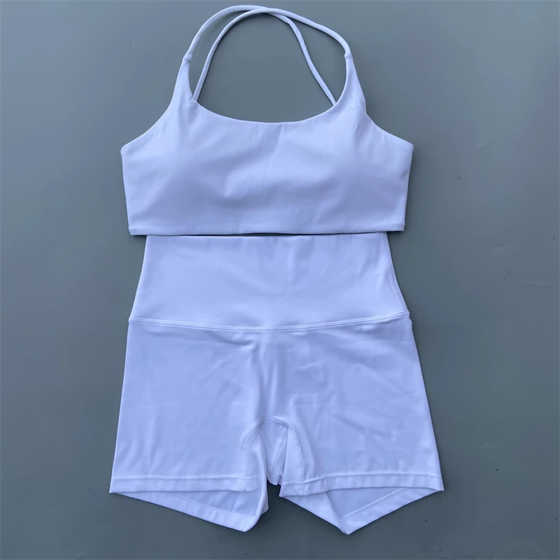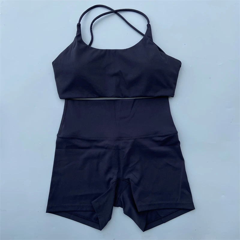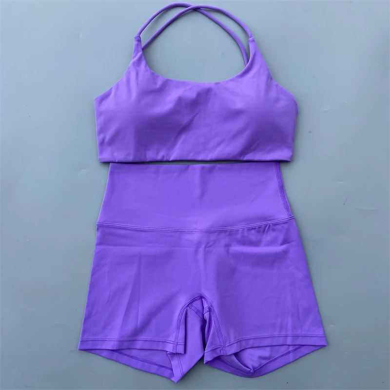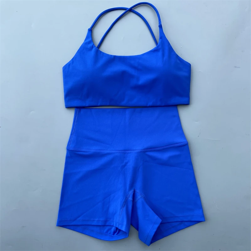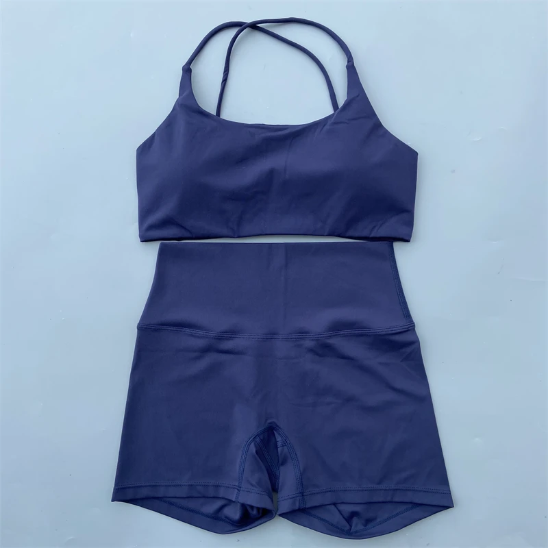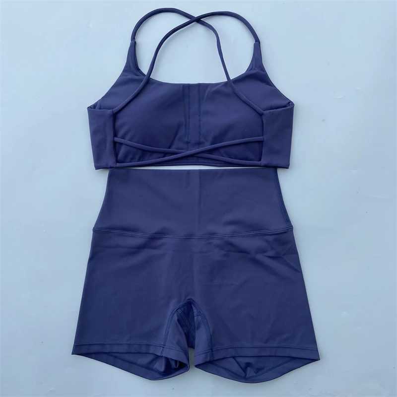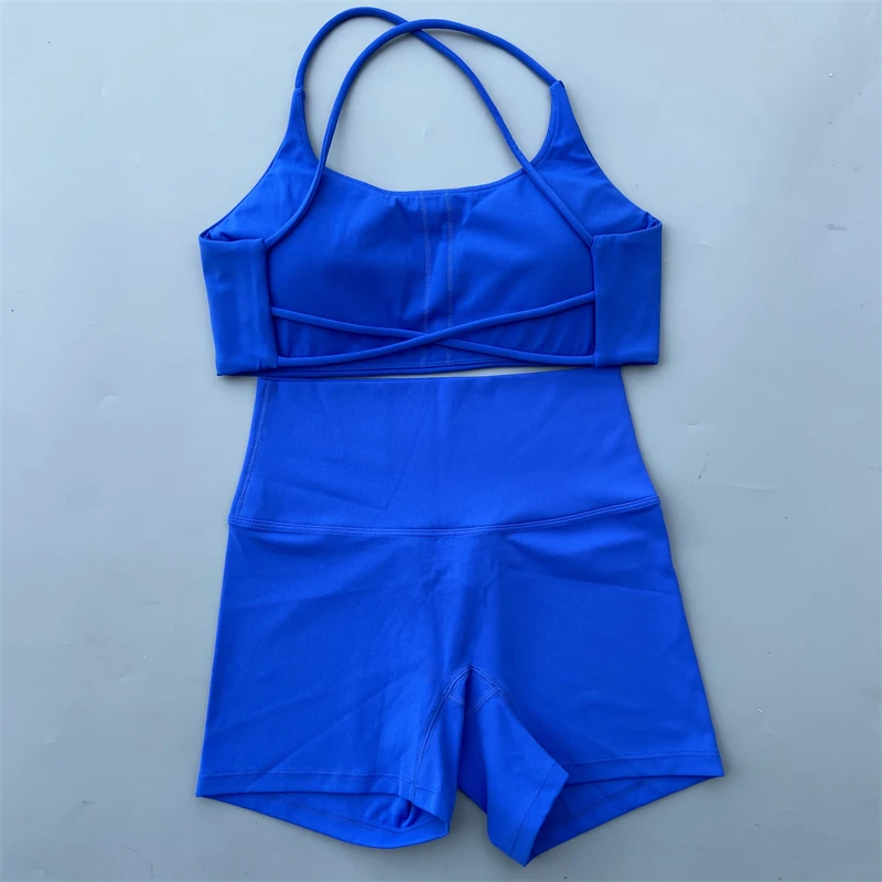 Yoga Shorts Set Gym Two Piece Sports Set Women Workout Outfit Fitness Suit Cross Straps Bra High Waist Shorts Running Tracksuit