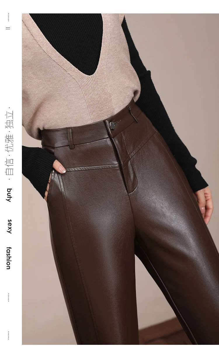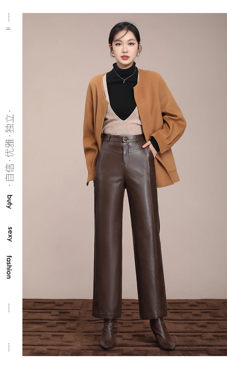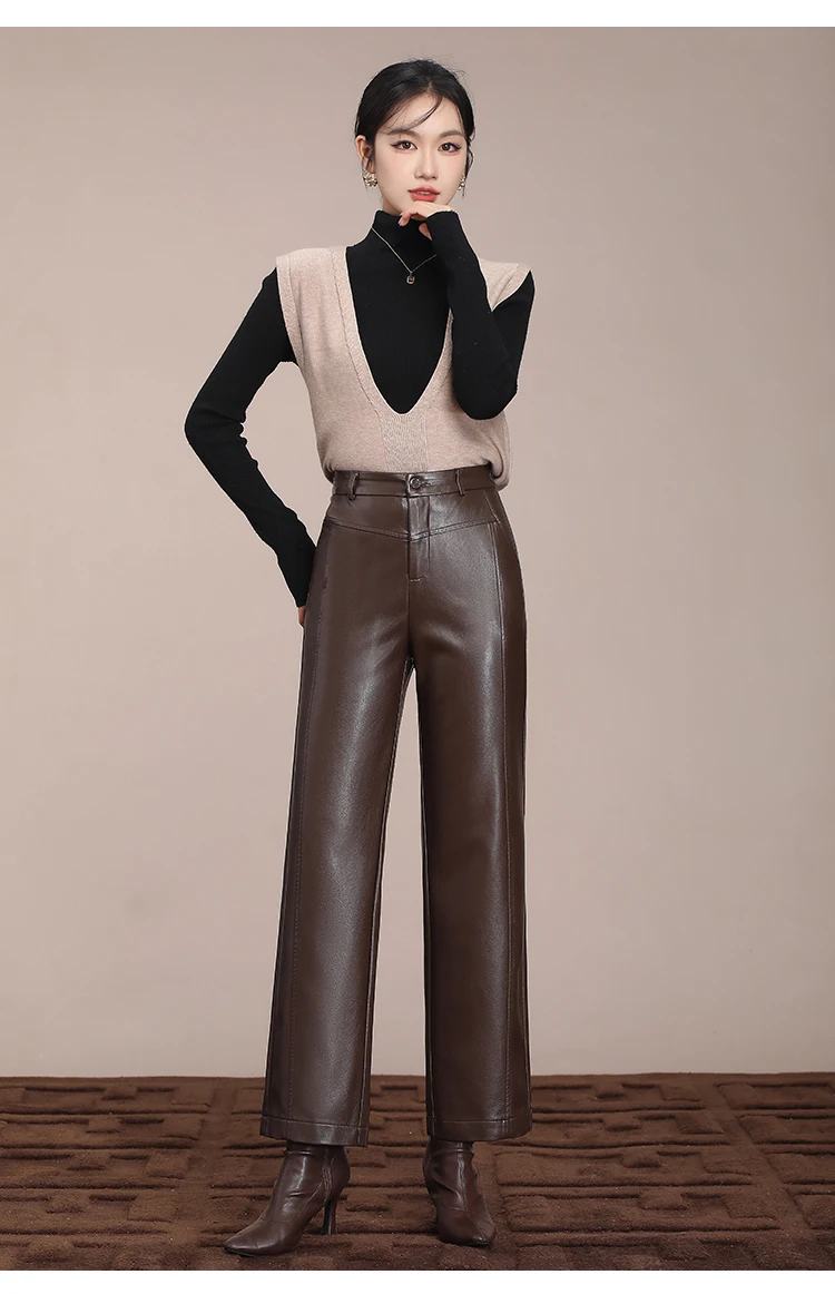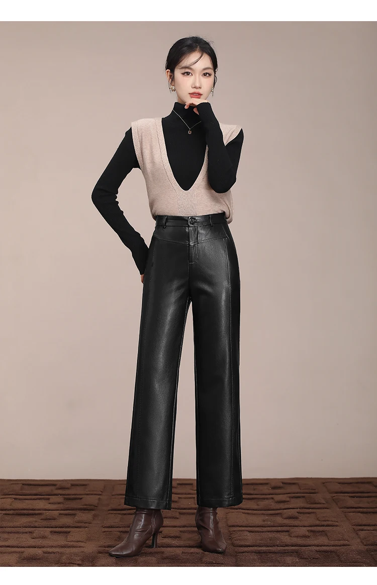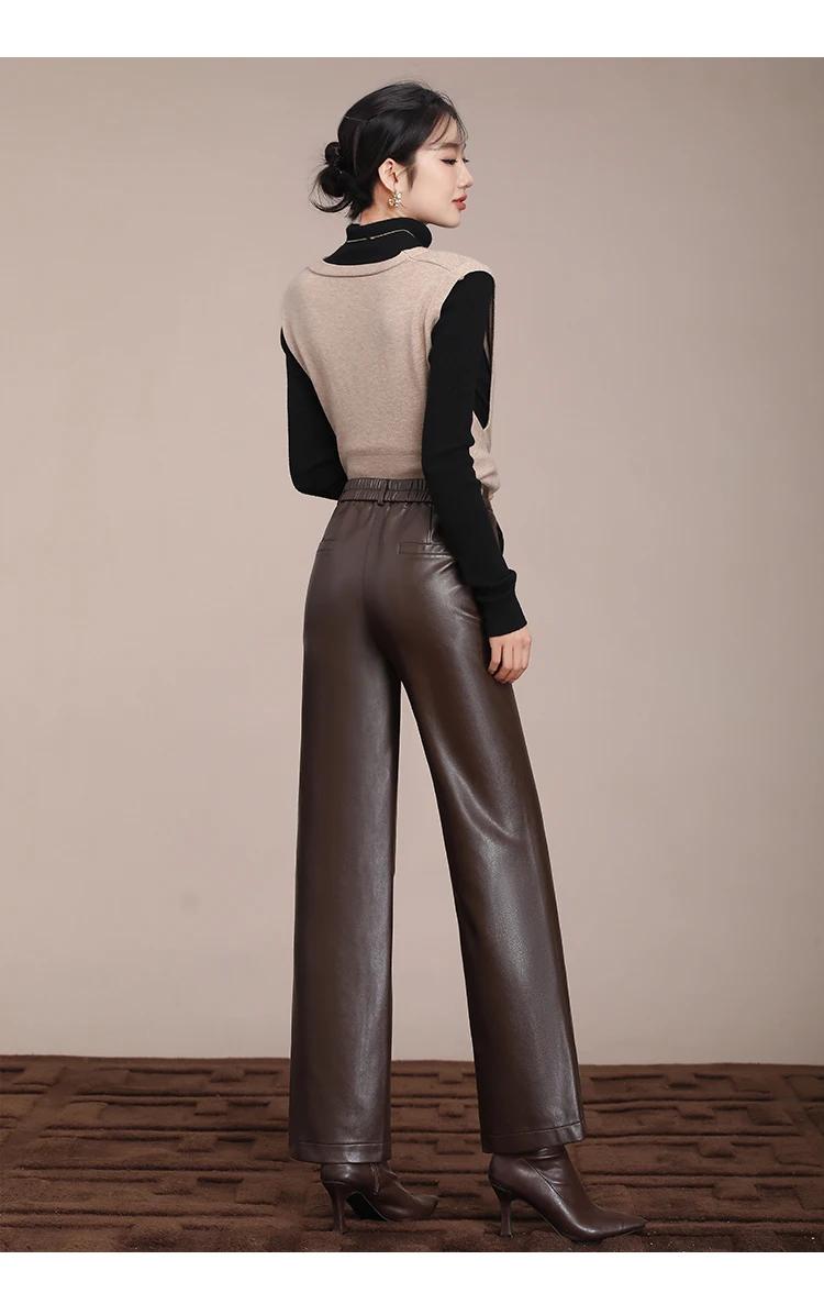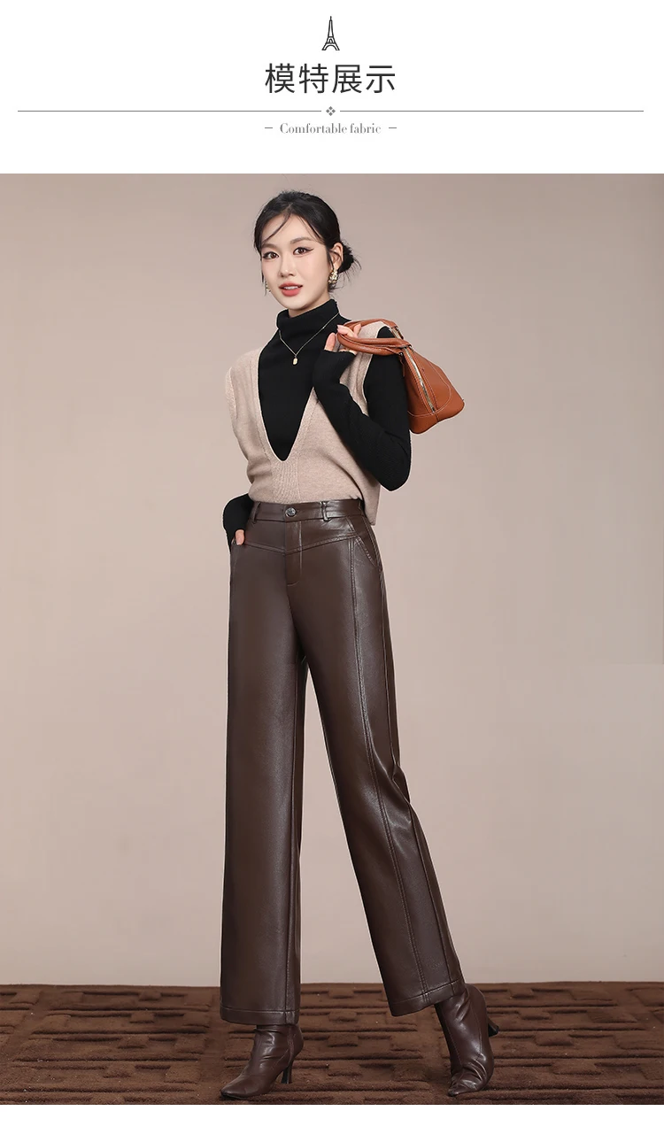 ZUZK Winter Pu Leather Pants New Elastic Waist Straight Pants PU Leather Trousers Large Size Fashion Warm Long Pants